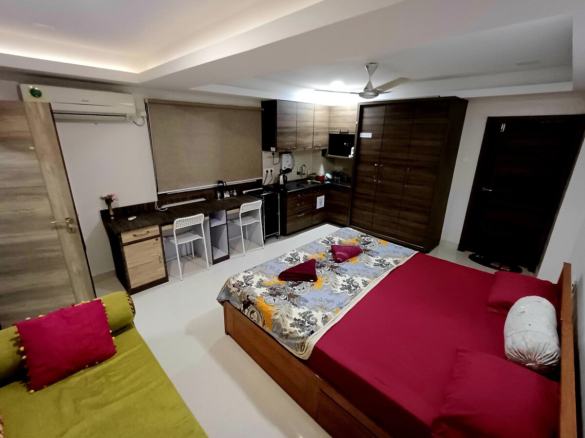Ovaj 1bhk se sastoji od spavaće sobe sa kupatilom, trpezarijskog hodnika i potpuno funkcionalne kuhinje. Soba je klimatizovana, a kupatilo ima gejzir. Nalazi se u prizemlju sa zasebnim ulazom. Dostupan je parking za jedan automobil/bicikl. Wi-Fi je dostupan. Prostor prikladan za parove za goste starije od 18 godina.