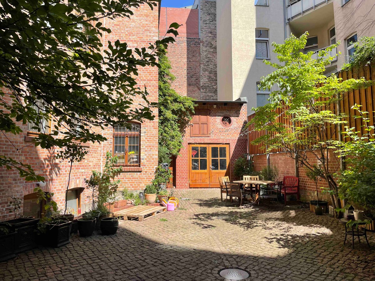 U dvorištu naše secesijske kuće u nizu, pripremili smo ovaj mali smještaj za vas. Kroz veliki ulaz u glavnu kuću, možete da pristupite dvorištu sa seoskom kućom koju koristite samo vi. Na raspolaganju vam je i vrlo malo kupatilo i mali objekat za kuvanje sa frižiderom. Terasa se, na primjer, ljeti može koristiti za doručak na suncu.