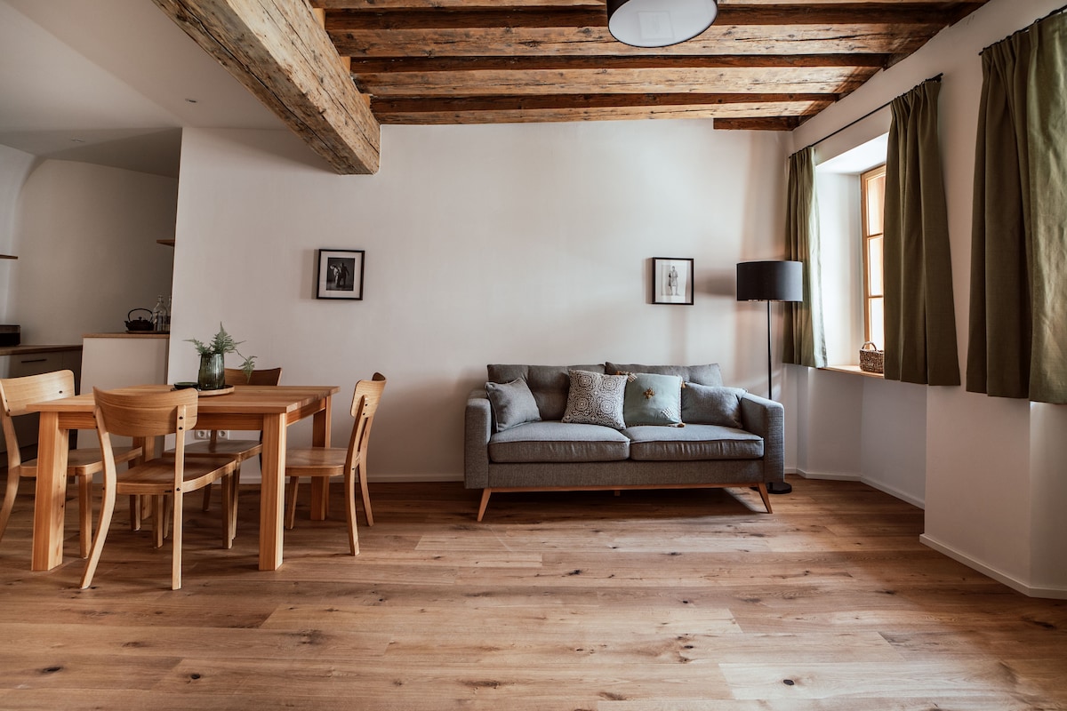 Mali, romantični stan u istorijskoj kući starijoj od 260 godina u podnožju Untersberga. Kroz centralni hodnik, dnevna soba, otvorena kuhinja, kupatilo i mala radna soba sa stolicom za spavanje na izvlačenje su povezani. Kroz dnevnu sobu možete doći do spavaće sobe, koja je opremljena bračnim krevetom. Kamin u dnevnoj sobi obezbeđuje prijatne večeri. Malo prednje dvorište sa trpezarijskim setom vas poziva da se opustite.