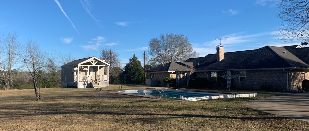 Seoska kuća se nalazi u borovima na 6 metara od glavne kuće Dvospratna seoska kuća od 800 kvadratnih metara ima sigurnost i bijela svjetla iz glavne kuće za osvjetljenje... Eklektičan stil sa nadsvođenim plafonom u velikoj spavaćoj sobi na spratu. U prizemlju - prostor za čajnu kuhinju/čajnu kuhinju ima TV i kauč na razvlačenje. *Napomena - Jedno seosko kupatilo se nalazi na prvom spratu. Nalazimo se na HVI 59 i 1 milju od I-20 ( u blizini svih lokalnih restorana) Caddo Lake St Park-30 minuta vožnje, Historic Jefferson & Enochs Stomp Winery both 20 mi.