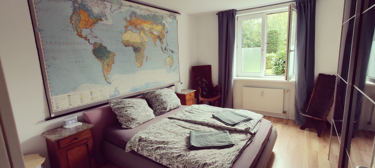 Živite u mojoj maloj i svježe renoviranoj kući u nizu u idiličnom okruženju. Imate jednu spavaću sobu sa bračnim krevetom, kupatilo i kuhinju-dnevni boravak za sopstvenu upotrebu. Stanica S-Ban udaljena je 3 minuta hoda, do aerodroma 2 stanice, centar grada 20 minuta. Besplatno parking mesto je dostupno na privatnom putu. Prodavnice su udaljene 3 minuta hoda. Staze za trčanje i vožnju biciklom odmah ispred vrata.