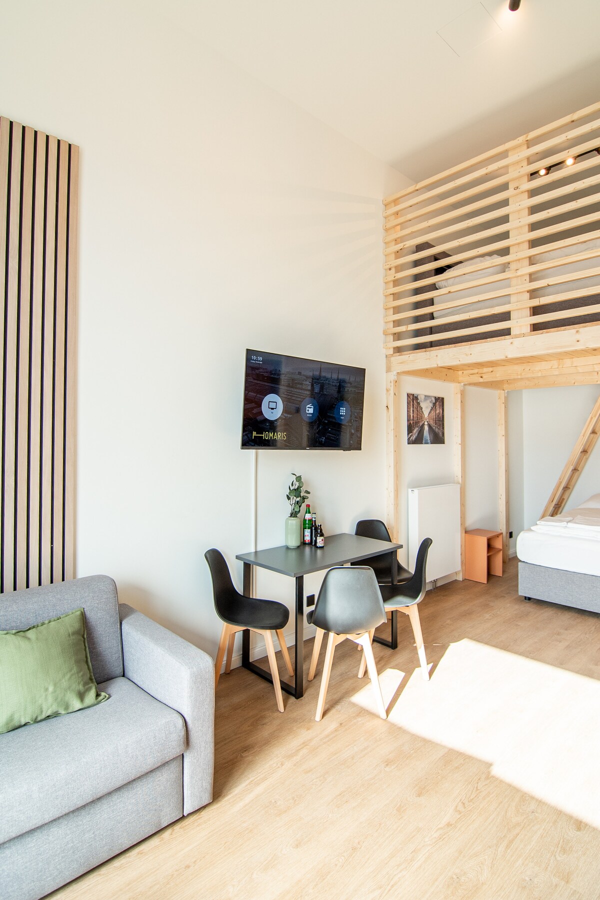 Studiji za najviše 5 osoba nude krevet na sprat sa dva bračna kreveta i kaučem koji se može pretvoriti u krevet za jednu osobu na 22 m². Potpuno opremljena čajna kuhinja ima indukcioni šporet sa 2 ploče, mašinu za sudove, frižider, mikrotalasnu pećnicu i aparat za kafu. Kupatilo ima tuš, fen za kosu i toalet.
