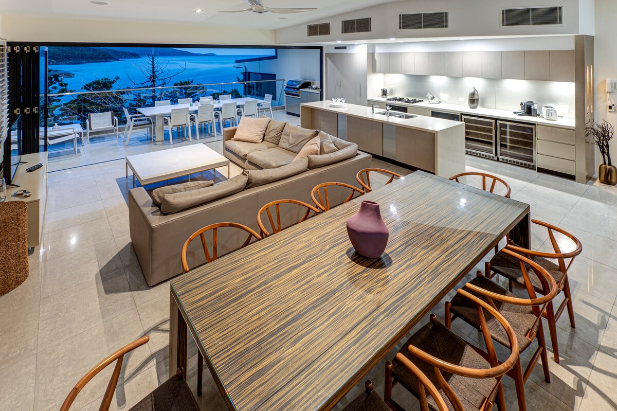 KOMPAS TAČKA 5 – Ova spektakularna, novoopremljena vila ima ZAPANJUJUĆI pogled na ostrva Dent i Plum Pudding. Favorit gostiju – jedan od najomiljenijih objekata na Airbnb-u prema gostima! Idealno je mjesto za lak pristup Velikom koralnom grebenu i drugim Vhitsunday ostrvima. Uključuje besplatne transfere sa uslužnim vozačem i golf vozilo. Može da primi najviše 7 odraslih i 1 bebu sa različitim konfiguracijama kreveta. Jedan od najtraženijih objekata na ostrvu!
