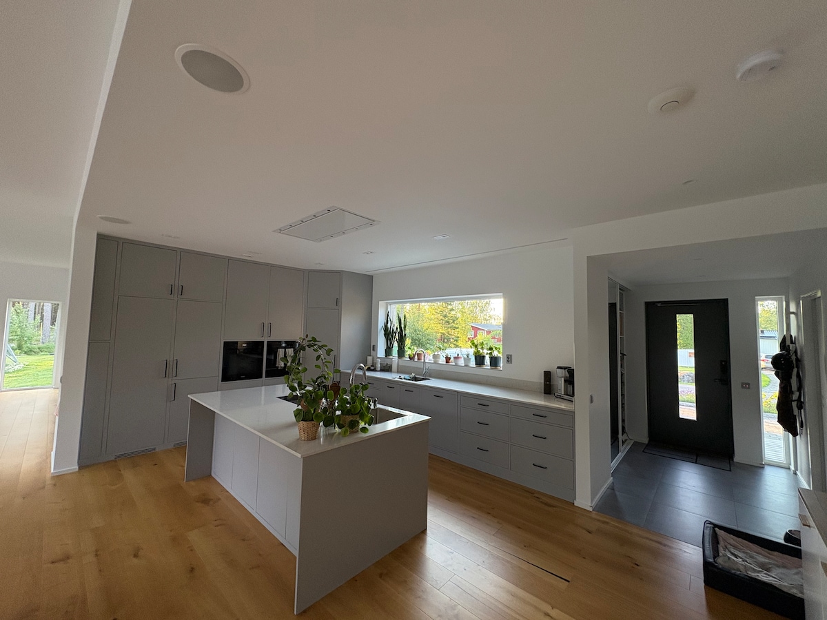 Iznajmite moju lijepu kuću na 2 sprata. U prizemlju se nalazi jednokrevetna soba, dvokrevetna soba i kuhinja i tuš. Na spratu se nalaze dvije dvokrevetne spavaće sobe, jednokrevetna soba, velika kuhinja i veliko kupatilo. Balkon s prednje strane s pogledom na jezero. 70 metara do plaže jezera Vern s lijepim kupalištima. Blizina Lillängshamnena sa dimnjakom od ribe, restoranom i kafićem. Kratka šetnja udaljena je od centra grada Skoghall sa nekoliko restorana, prodavnica, medicinskog centra i teretane itd. Autobus ide do Karlstada svakih 12 minuta i vozi vas tamo za 11 minuta