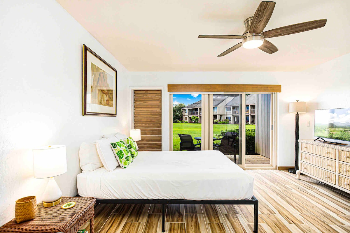 Ovaj prelepi renovirani studio se nalazi na bujnoj i romantičnoj severnoj obali Kaua'i. Opremljen klima-uređajem, VITAMIX Blender, Nebeski bračni krevet, čajna kuhinja, rešo, 2 televizora sa ravnim ekranom, pouzdanim i pouzdanim Wi-Fi mrežom. Budite spremni da uživate u pogledu koji oduzima dah i planinarenju, ronjenju sa maskom i disalicom i plažama sa ove idealne lokacije na severnoj obali. Kratka šetnja do plaže Hideaways i Queen 's Bath i kratka vožnja do Hanaleija. To je više od kuće za odmor, to je raj!