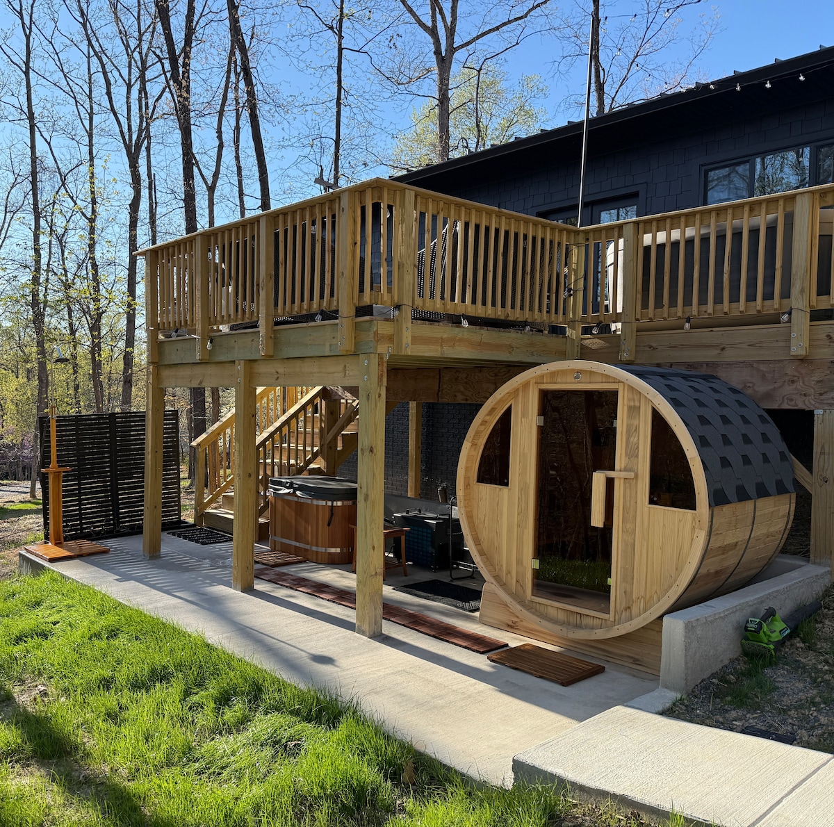 Pobjegnite u našu modernu brvnaru na 12 privatnih hektara. Opustite se u hidromasažnoj kadi na drva, uživajući u okruženju i zvijezdama noću. Savremenim dizajnom i prirodnim svjetlom, ovo utočište se stapa s prirodom. Istražite privatne staze u cijelom objektu, uživajući u prirodi i svježem vazduhu. Unutra pronađite udobnost u potpuno opremljenoj kuhinji i udobnom dnevnom boravku. Savršen za miran odmor, naš dom na osami pruža privatnost i opuštanje.
