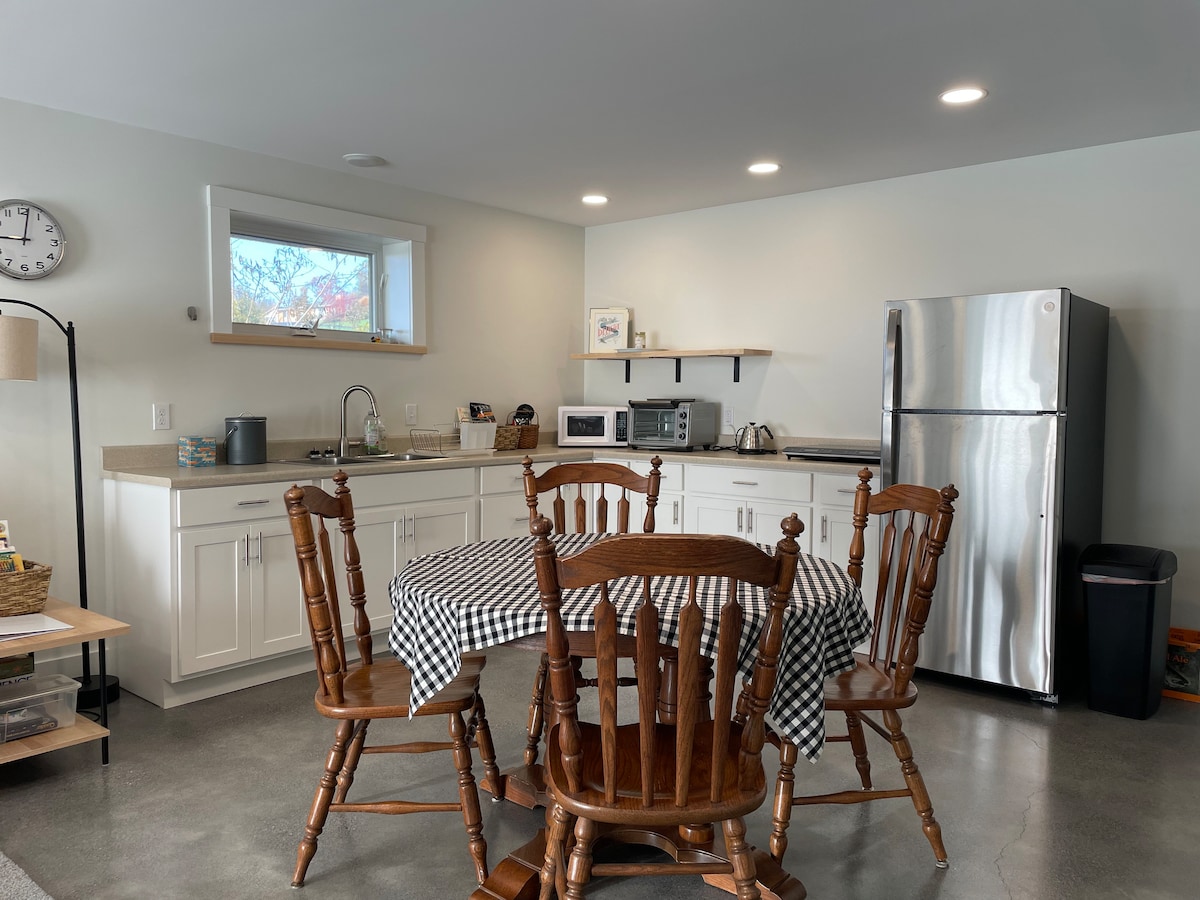 Prostran i moderan podrumski studio apartman otvorenog koncepta sa privatnim ulazom. Uživajte u čajnoj kuhinji (sa malim frižiderom, konvekcijskom toster-pećnicom, mikrotalasnom pećnicom, mašinom za pranje sudova i indukcionom pločom za kuvanje). Wi-Fi, direktni TV i Chromecast. U trpezariji se nalazi prelijepa terasa na otvorenom sa roštiljem i pogledom na planine koji oduzima dah. Pitajte domaćina ako želite da koristite peć na drva. Pročitajte štampani primerak informacija. Domaćin se nalazi na prvom spratu.