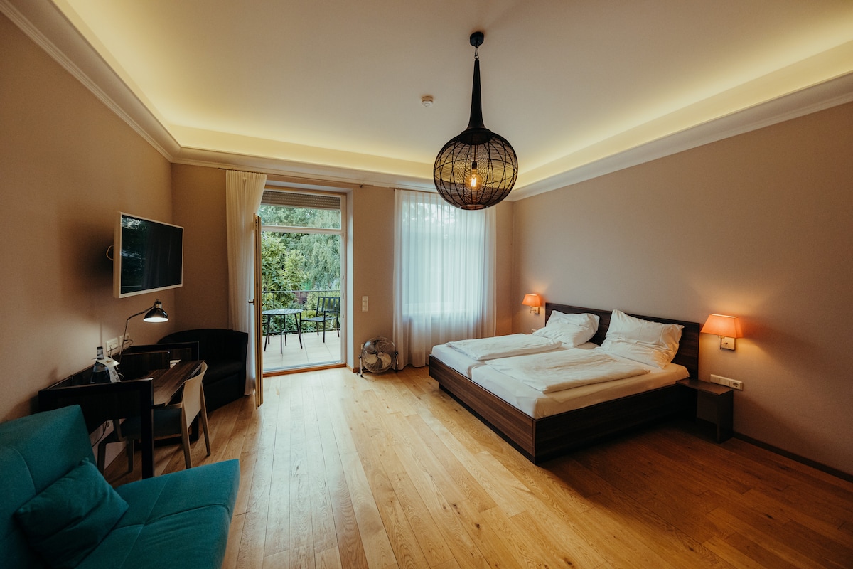 Prostrana dvokrevetna soba sa kupatilom i čajnom kuhinjom. Biće nagrađen kao junior apartman za 1-2 osobe ili kao porodična soba za 2 odrasle osobe i 1-2 dece. Veliki kauč se zatim priprema kao sofa.