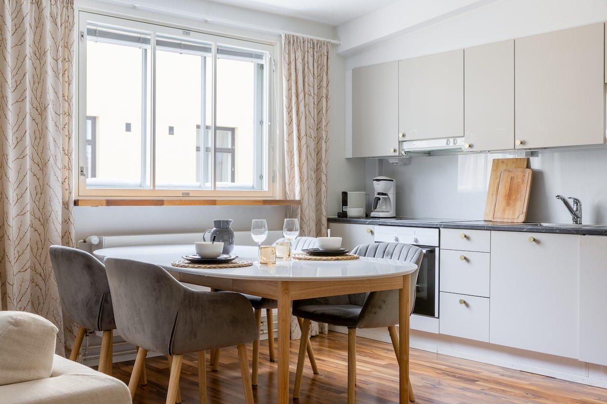 A modern and stylish one-bedroom apartment, located above the Mall of Tripla shopping center. The apartment features a well-equipped kitchen, fast Wi-Fi, laundry facilities, and all the essential amenities to ensure a comfortable stay, whether short or long. Are you visiting Helsinki for business or just a quick getaway? Whatever the reason for your stay, you are warmly welcome to enjoy this apartment—also for longer stays if needed!