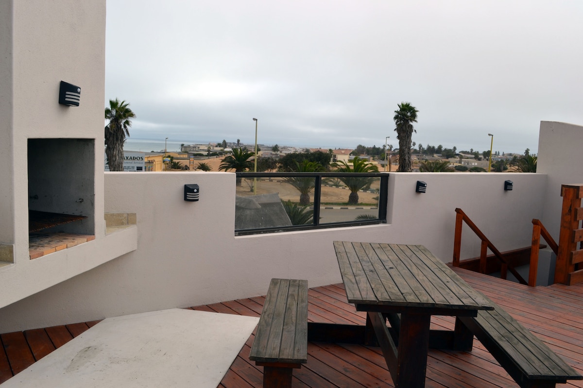 Uredan i prostran stan sa 2 spavaće sobe, kupatilom, dnevnim boravkom otvorenog tipa i kuhinjom. Roštilj na otvorenom i terasa sa fantastičnim pogledom na okean i pustinju. Nalazi se na prvom spratu u CBD-u. To je mali grad za odmor sa velikim srcem. Vaše zaustavljanje na putu do i iz Damaralenda i Etoše. Savršen boravak u bazi za svakodnevne izlete u blizini. NEMA GARAŽE Veš je dostupan na zahtjev. Dnevne usluge čišćenja na zahtjev. Možemo da smjestimo još 2 osobe.