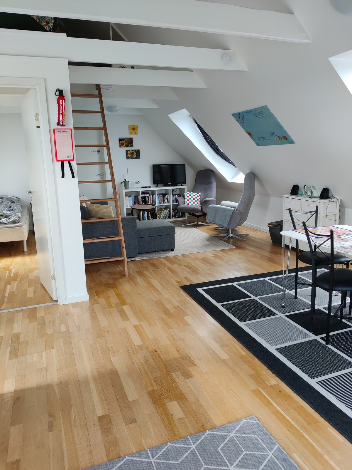 Stan se nalazi na prvom spratu naše kuće, mi živimo na suprotnom kraju u dnevnoj sobi. Sadrži: 1 toalet sa tušem, kuhinju sa šporetom/pećnicom, aspirator, aparat za kafu, električni čajnik i frižider sa malim zamrzivačem. Kuhinja sadrži sve što vam je potrebno. 1 spavaća soba sa bračnim krevetom, komodom i šipkom za vešanje. Dnevna soba sa TV-om, 2 fotelje i kauč (koji je takođe kauč na razvlačenje). Kuhinja, trpezarija, dnevni boravak i „hodnik“ su u jednom. U dnevnoj sobi postoji TV sa DVD-om i kromkasterom, naravno imaćete pristup i fibia mreži.