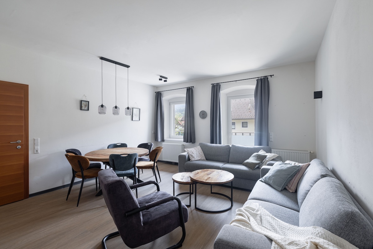 Naša istorijska seoska kuća na osamljenoj lokaciji iz 1841. godine s ljubavlju i pažljivo je renovirana. Mnogi međunarodni gosti su već proveli lep odmor usred predivne prirode i uživali u alpskoj udobnosti sa modernim sadržajima. U 2019. godini potkrovlje i bivši mlin pretvoreni su u penthaus stan na dva sprata u stilu planinske kuće. Sunčani stan, kao i natkrivena prostrana sedišta na otvorenom pružaju neometan pogled.