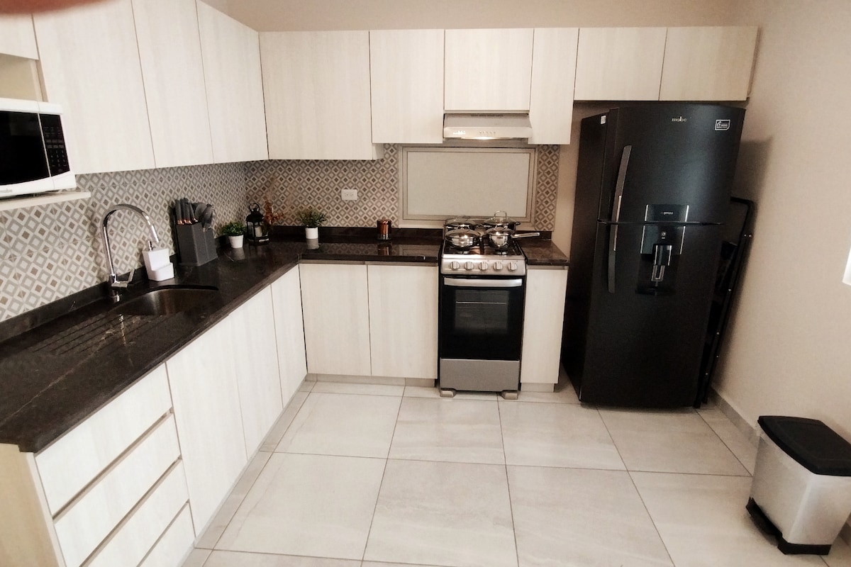 Stan u prizemlju, klimatizovane sobe okružene turističkim atrakcijama, restoranima, tržnim centrima , muzejima, 3 minuta od plaža i 2,5 km od akvarijuma Verakruz (jedan blok od karnevala i maratona) - Kosa i trpezarija sa pametnim TV-om, kompletna kuhinja sa pogledom na malu privatnu centralnu baštu. - Glavna spavaća soba sa bračnim krevetom, kupatilom, garderobom i pametnim TV-om. - Sekundarna kamera sa bračnim krevetom i ormarom. - Garaža za automobil sa električnim vratima.