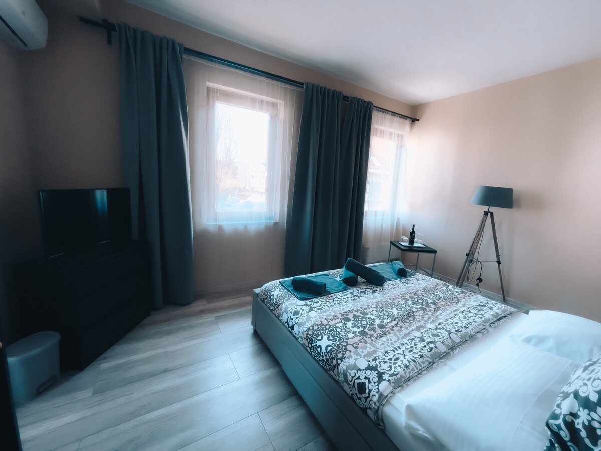 Dobro došli u stan za porodicu sa troje dece ili za grupu od petoro ljudi. Spavaća soba je odvojena vratima od druge sobe, koja ima kupatilo sa tušem, WC školjkom, umivaonikom i modernim ogledalom sa satom i led svetlom. Svaka podijeljena soba ima svoj TV. Ovaj stan ima direktan pogled na glavni put centra grada. Radujem se vašoj poseti!