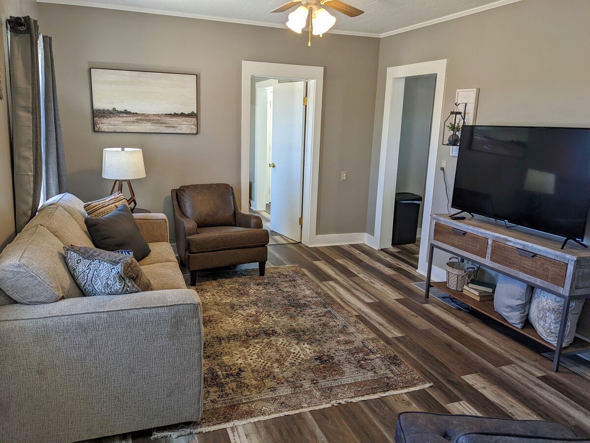 Tri spavaće sobe, dva kupatila, trpezarija, kuhinjski drveni podovi u cijelom dnevnom boravku, parcela na uglu sa ogradom za privatnost na južnoj i zapadnoj strani. Jednostavan pristup prodavnici, benzinskoj stanici, kozmetičkom salonu, biblioteci, crkvi, restoranima. Gosti sa produženim boravkom (rezervisani na nedelju dana ili više) će uživati u znatno sniženim cenama (koje spadaju u smjernice za dnevnice GSA). Vaša grupa ili porodica mogu da uživaju u životu malog grada dok se opuštaju uz svu udobnost doma