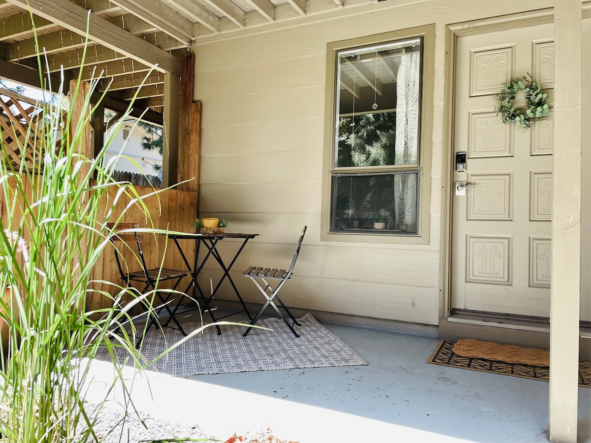 Opustite se u našoj jednosobnoj potpuno privatnoj jedinici u prizemlju sa zasebnim ulazom. Uživajte u svježem vazduhu i mirnim ulicama obrubljenim drvećem u jednoj od starijih četvrti Benda. Udaljeni smo pješke do Bruksvud Plaze i samo 5 minuta vožnje do okruga Old Mil, rijeke Deshutes i manje od 10 minuta do centra Benda. Potpuno opremljena čajna kuhinja (bez rerne ili zamrzivača). Sklopivi kauč u stilu futona za dodatne goste. Parking na prilazu u sklopu objekta i dodatni parking na ulici.