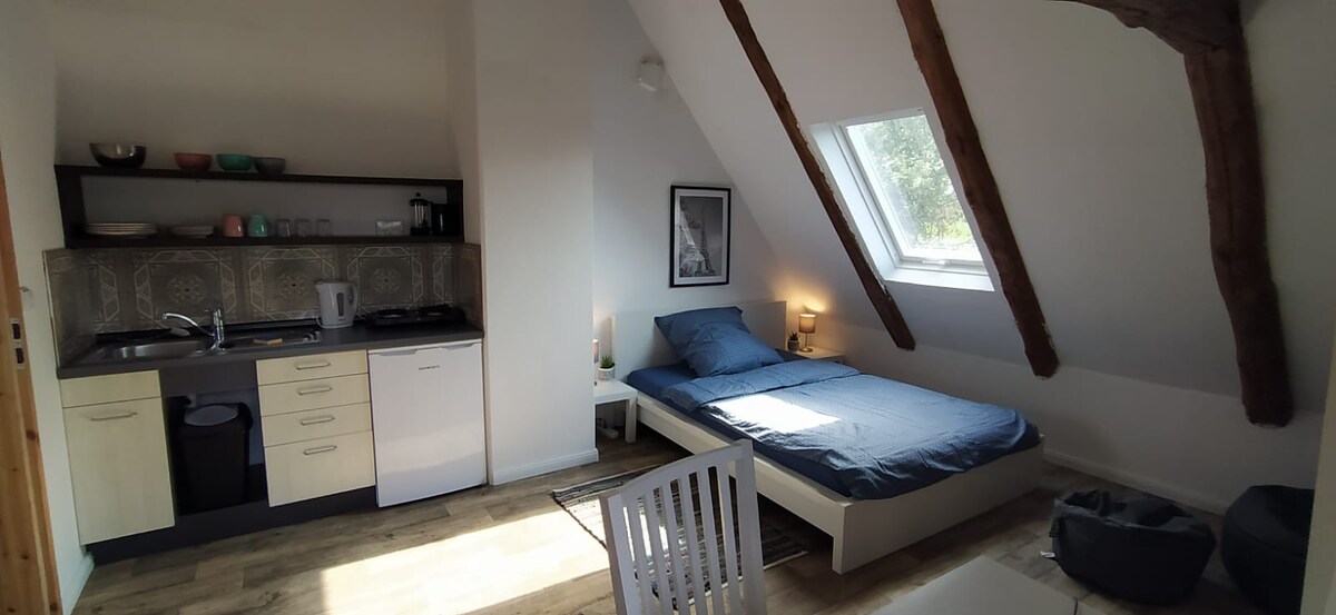 Studio sa 1 spavaćom sobom u najstarijem delu naše porodične farme. Svetla, prijateljska soba sa bračnim krevetom i krevetom za jednu osobu, mala kuhinja i tuš kabina. Do sobe možete doći spoljašnjim spiralnim stepeništem preko povezane male krovne terase sa pogledom na polja. Odlično za bicikliste, montere i odmor.