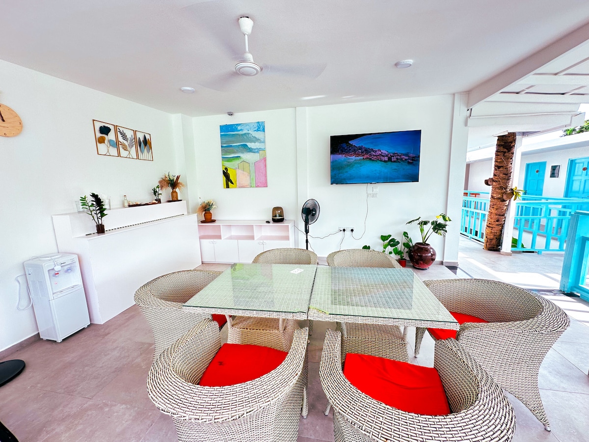 Uživajte u vrhunskoj udobnosti na Airbnb-u uz plažu sa zadivljujućim pogledom na more, 10 minuta od aerodroma. Sa bračnim krevetom i spavaćom sobom s bračnim krevetom, besplatnim Wi-Fi-jem i slikovitom ljepotom, to je savršeno utočište uz more. **Imajte na umu da je naš objekat klasifikovan kao Homestay i da poštuje maldivske propise izdavanjem zasebne reference rezervacije za potrebe imigracije. Nakon što dovršite rezervaciju, slobodno zatražite referencu rezervacije ako je potrebno, jer je isključivo za imigracionu upotrebu.**