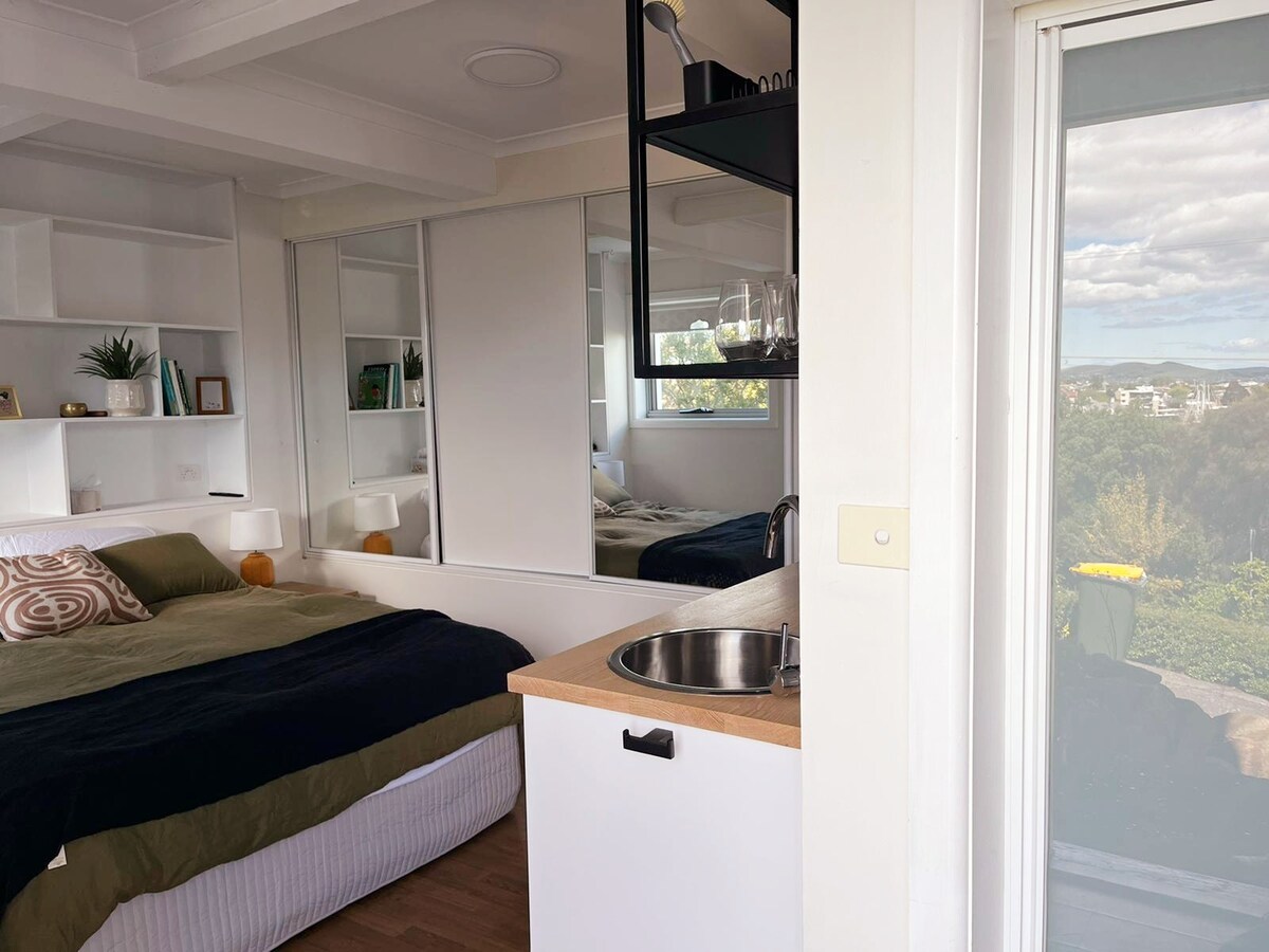 Skenirajte QR kôd na fotografijama za kompletan video obilazak! Butik 1BR skrovište za parove, odmah pored potoka. Samo 2 km od CBD-a, ovaj tihi smještaj je idealan za istraživanje grada, MONA i Salamanka. Bez naknade za čišćenje. Opustite se u potpuno novom bračnom krevetu, uživajte u pogledu na zelenilo i modernom uređenju i započnite dan uz besplatnu Nespresso kafu. Ultrabrzi Starlink Wi-Fi sa Netflix-om, Disney+, Binge i Stan. Čisto, udobno i blizu svega.