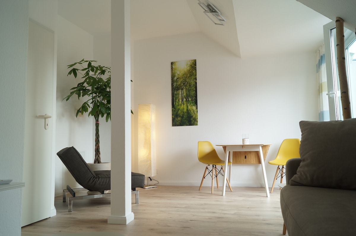 Stan ili zanatski smeštaj u Hohen Neuendorferu Najbolja lokacija, severno od Berlina: Uživajte u prijatnom boravku u otmenom ambijentu u udobnom, potpuno opremljenom stanu u potkrovlju. – 2 sobe (4 kreveta), kuhinja, kupatilo sa tušem, balkon – Parking je dostupan tačno ispred kuće – Smart TV, Wi-Fi – Frižider, šporet, rerna, mašina za sudove, aparat za kafu, aparat za espreso, čajnik, roštilj, toster – posteljina, peškiri