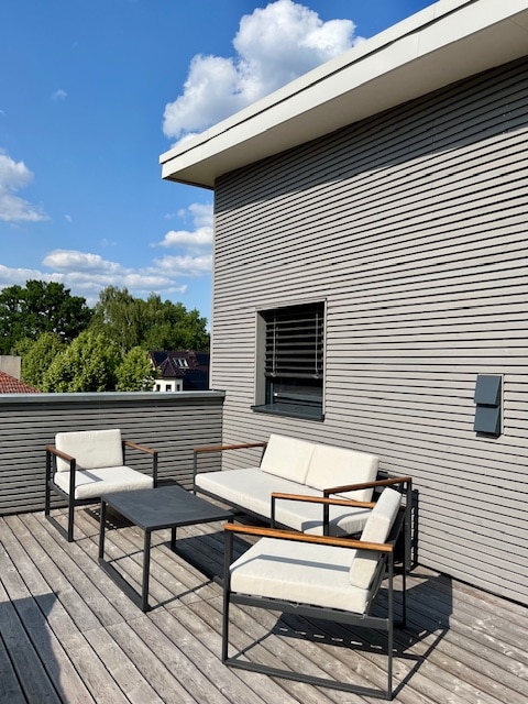 Naš novi studio u blizini Berlina - prva popunjenost 2024. godine - nudi vam sve što vam je potrebno (bez TV-a). Vrhunac je prostrana krovna terasa (30 m²) sa ležaljkama i suncobranom za potpuno opuštanje i zagarantovanim pogledom na zalazak sunca. Okružen zelenilom sa obližnjim jezerima i planinarskim stazama i idealan za izlete u Berlin i okolinu. Savršeno povezan - nekoliko minuta od A111/A10 i za 30 minuta javnim prevozom (S1 / S8) u Berlinu.