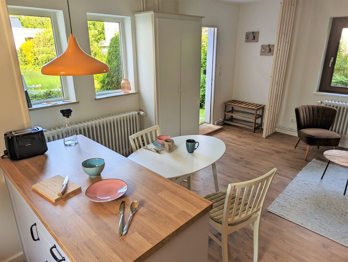 Mali udoban, ukusno uređen apartman na Baltičkom moru - nekoliko koraka i na plaži ste! Stilski krov/ poluzatvorene kuće u velikoj bašti sa starim drvećem su deo životne sredine. Predivan odmor na beskrajnoj beloj plaži Baltičkog mora. Savršeno za 2-3 gosta. Netaknuta priroda: strma obala, prirodni rezervati, prirodne šume, vile i dvorci, jahanje, jahanje, golf i biciklističke staze i more sa finom peščanom plažom vas čekaju!