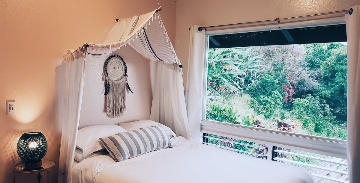 Dobro došli u svoje malo parče raja! Novouređena kuhinja, LR i kupatilo! Baštenska koliba je sa tri strane okružena gustom šumom. Uživajte u kafi i zalascima sunca na svom privatnom tremu s pogledom na našu farmu tropskog voća, okean i nebo za posmatranje zvezda. Ptice pevaju, hor žaba i vrana divlje petlova su samo neki od „zvukova džungle“ koji će vas okružiti. Seoska kućica se nalazi između dva prelepa zaliva koja ugošćavaju neke od najboljih ronjenja na Havajskim ostrvima.