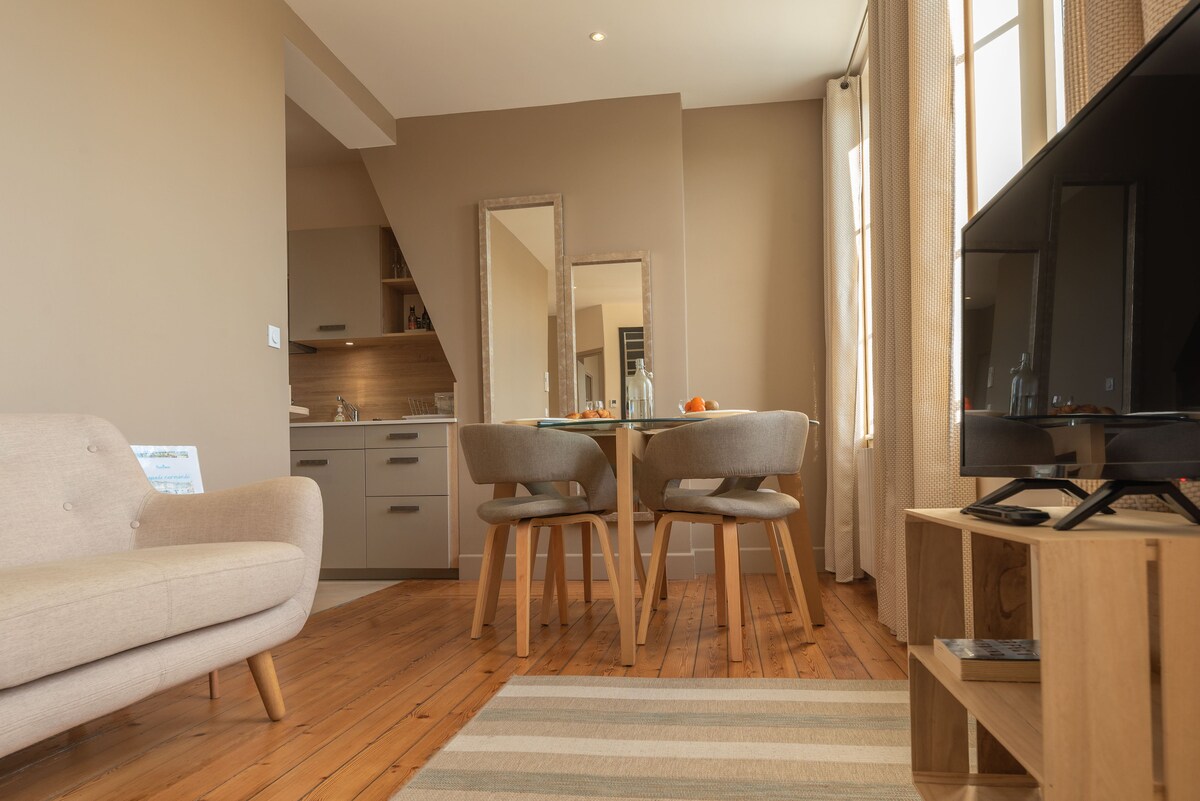 Treat yourself to an unforgettable getaway facing Honfleur’s Old Harbor! This charming studio is the only one with a real balcony where you can dine while watching the boats glide by. Queen-size bed, fibre Wi-Fi, linen and cleaning included. Free parking nearby, pets welcome. A rare gem—perfect for a romantic escape or a salty break in the very heart of town.
