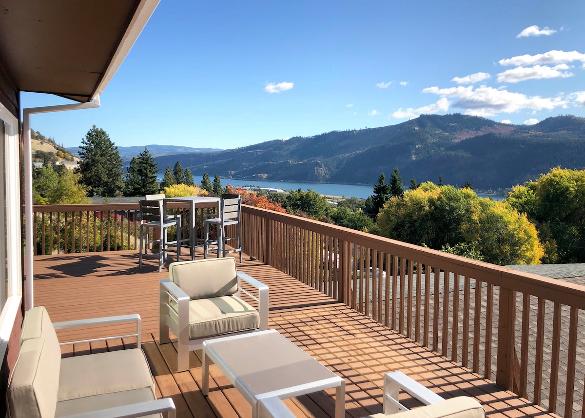 Deluxe apartman s pogledom na rijeku White Salmon i Columbia, manje od milje od rijeke Hud. Okruženi ljepotom klisure i planinarskim stazama. Uključuje: hidromasažnu kadu; kamin; privatni parking i ulaz; snabdevenu gurmansku kuhinju, kupatilo sa tuš kabinom, bračni krevet, kauč na razvlačenje i dušek na podu. Apartman ima Wi-Fi, TV sa ravnim ekranom, AppleTV, BluRayDVD i Apple HomePod. Gosti takođe imaju pristup baštama sa terasom u domu, ribnjaku koi, kaminu, trpezariji na otvorenom, hidromasažnoj kadi i teretani u domu.