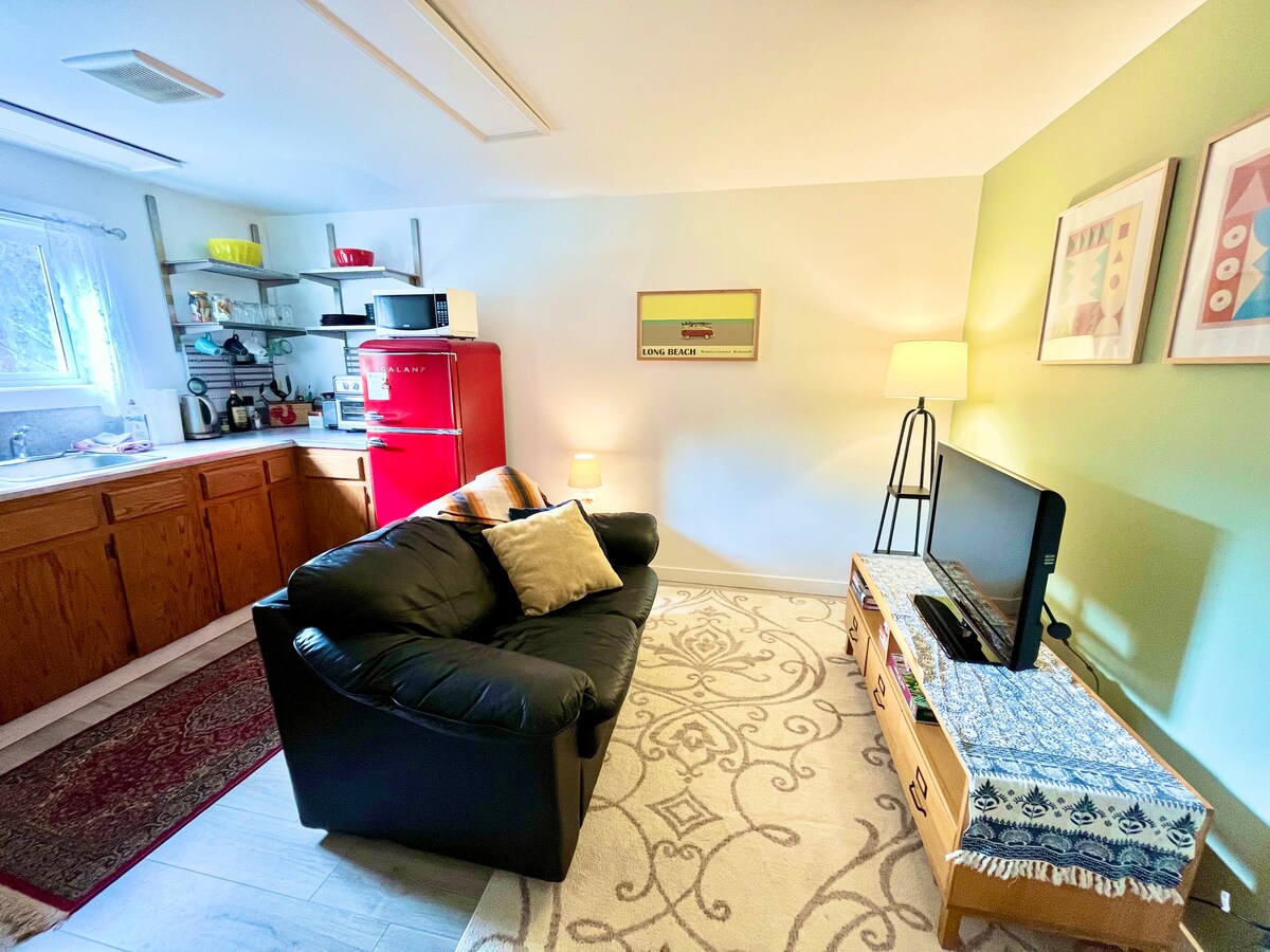 Svetli i prozračni apartman iznad naše garaže sa pogledom na šumu i bašte. Prostor ima potpuno opremljenu kuhinju, udoban krevet i kauč, sve je otvoreno. Uživajte u obilju prirodnog svjetla sa prozora i krovnih prozora. Prostor obuhvata i trodelno kupatilo i mali sto i 2 stolice za ručavanje ili upotrebu kao radna stanica. Nalazimo se nedaleko od Parksvila u ruralnom području. Ovo je odlična centralna lokacija za istraživanje ostrva i samo na 10 minuta od centra Parksvila.
