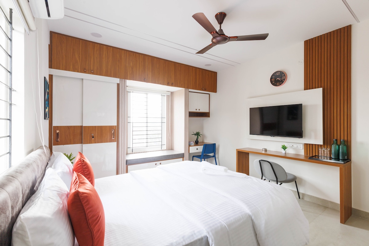 Dobro došli u Buteak Suites, vaše savršeno urbano utočište u živopisnom BTM Layou, Bengaluru. Spajajući toplinu stana sa sofisticiranošću gostoprimstva butik hotela, naš pažljivo dizajnirani 1 BHK veliki apartman(460 kvadratnih stopa) i Izuzetno veliki apartman (530 kvadratnih stopa). Bilo da ste ovdje poslovno ili u slobodno vrijeme, uživajte u besprekornom boravku sa modernim sadržajima, fleksibilnim prijavama, besplatnom pristupu teretani od Kult Fit-a i svakodnevnom neograničenom čišćenju.