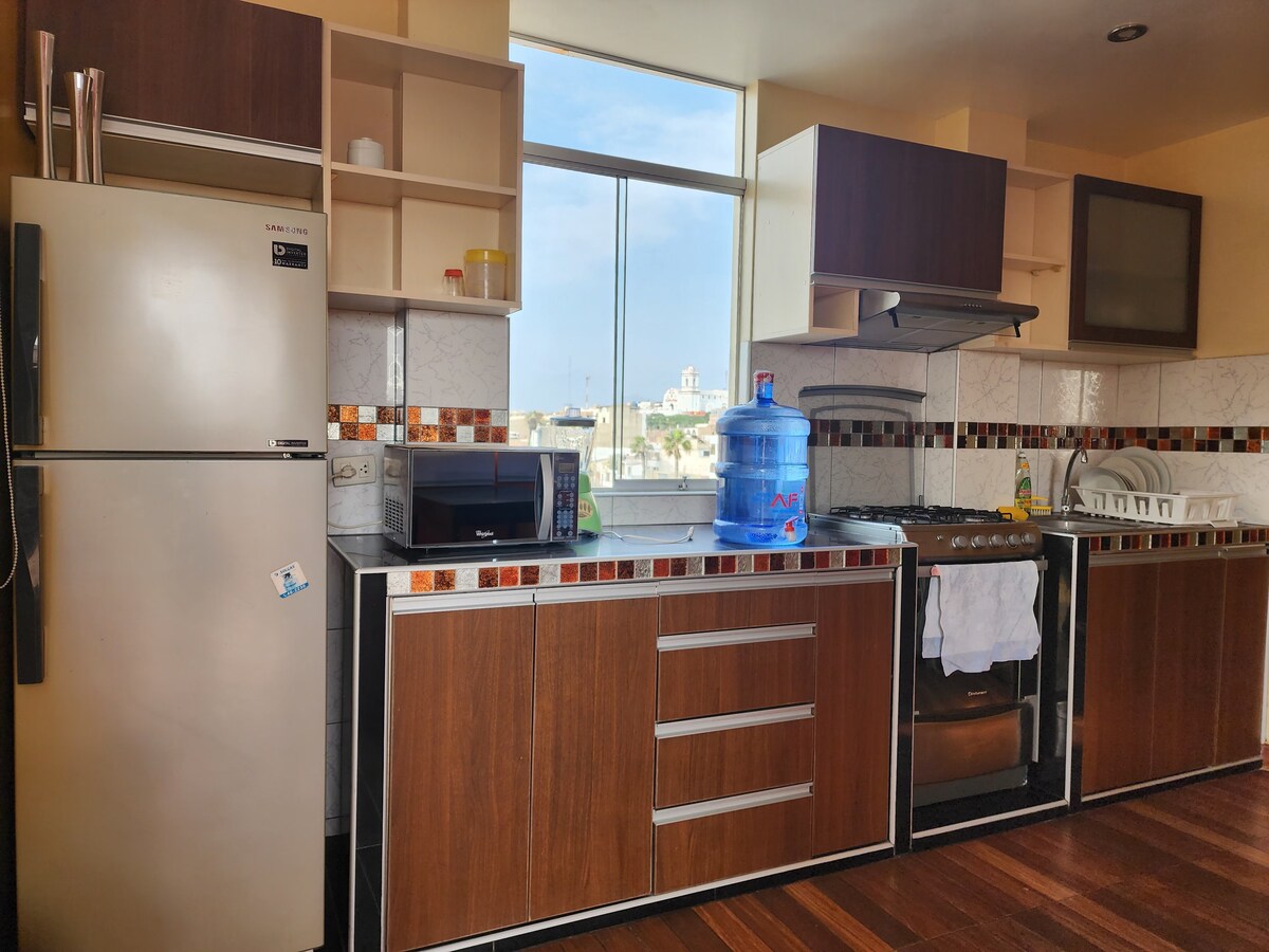 85 metara, potpuno OPREMLJEN i NAMJEŠTEN,sa ZADIVLJUJUĆIM POGLEDOM na ISTORIJSKI TRUHILJO i koji zadovoljava zahtjevnije uslove:elegancija, udobnost, VISOKA BEZBJEDNOST (ISPRED PNP-a),ODLIČNA lokacija i ZDRAVLJE. Jeftin VIP smještaj. U srcu istorijskog centra, PROVETRENO i dezinfikovano, blizu svega (Mercado Plaza Vea i Plaza de Armas). Sa internetom, tri spavaće sobe (bračni krevet i kreveti za jednu osobu), dvostruki lift i dječje igre, kao i garaža