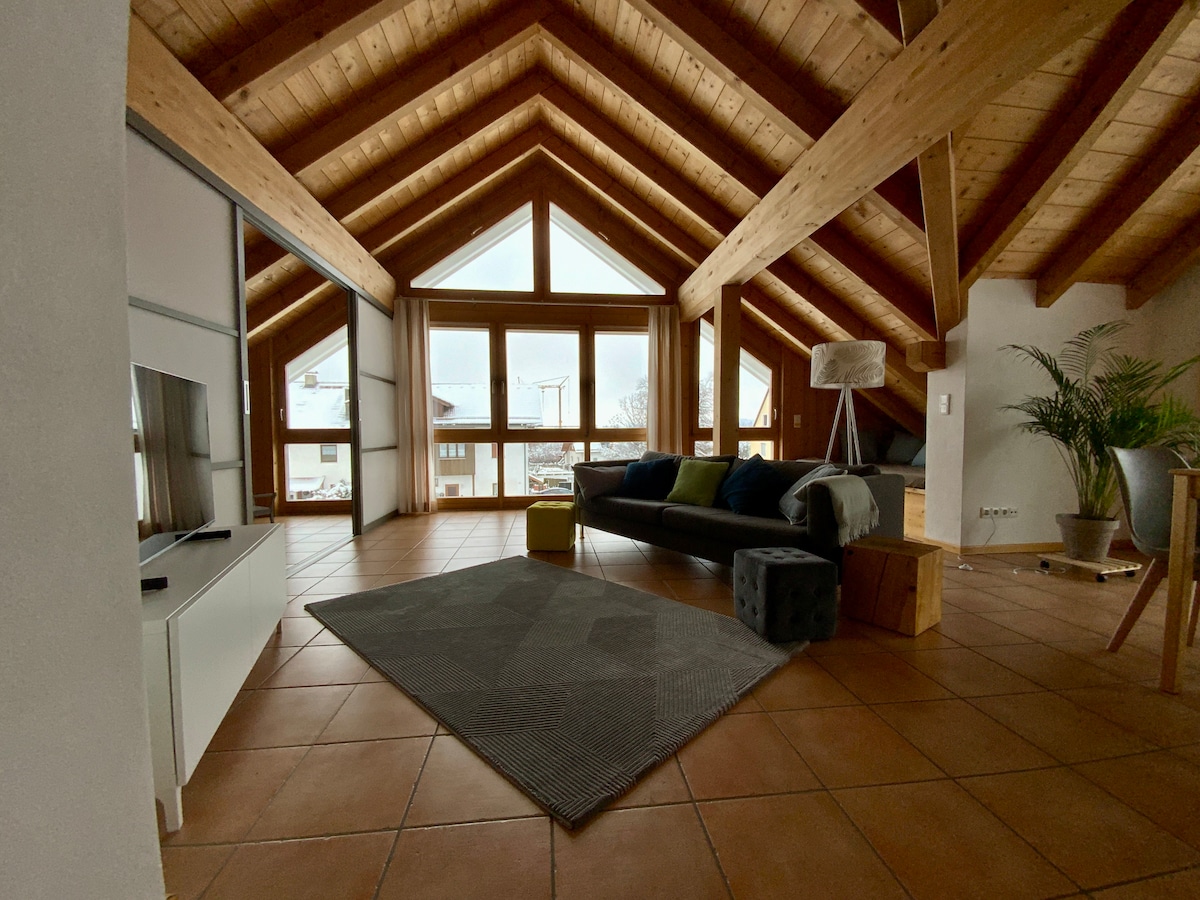 Vrlo lijep, svijetao stan u potkrovlju, nova zgrada 2023. godine, s balkonom i pogledom na Alpe. Otvoreni tavan, opremljena kuhinja sa indukcionom pločom za kuvanje, rernom na topli vazduh, mikrotalasnom rernom, mašinom za pranje sudova i uobičajenom opremom. Tuš kabina sa WC šoljom, tuš-kabinom u prašumi i krovnim prozorom. Balkon od 6 m² s pogledom na planine. Mala spavaća soba sa krevetom dimenzija 140 x 200 kreveta, garderobom i krovnim prozorom.
