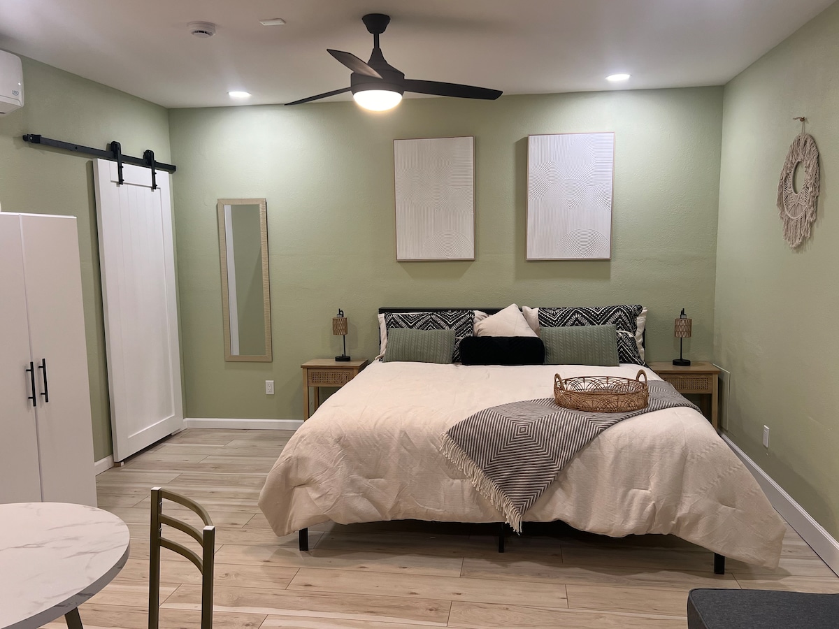 Dođite i opustite se u našem mirnom studiju i pronađite sve osnovne sadržaje koji su vam potrebni. Uđite kroz privatni ulaz, soba je potpuno privatna. Spavajte udobno na našem luksuzno čistom bračnom krevetu. Odmorite se od vrućine uz naš rashladni vazduh. Nalazi se na samo 10 minuta od aerodroma u El Pasu i 15 minuta od Biggs Fielda. Tržni centar Cielo Vista i fontane u Farri takođe su udaljeni samo nekoliko minuta vožnje (12 minuta ). Nećete zažaliti ako izaberete naš studio kao svoj dom.