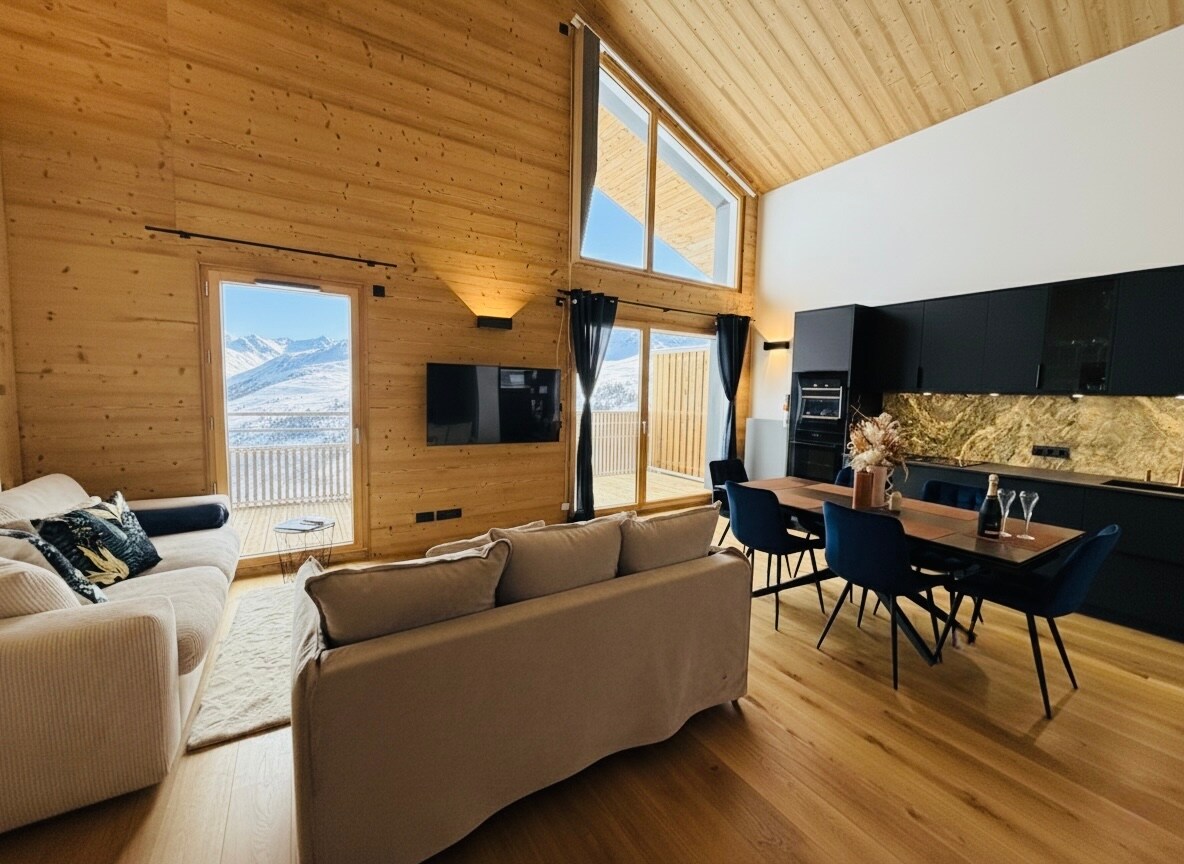 Novoizgrađeni luksuzni stan 95 m2 na skijalištu, 3 spavaće sobe i dodatna brvnara sa krevetom na sprat, ukupno 8 kreveta, sa zajedničkim velnesom, saunom/hamamom , fitnesom i bazenom. Možete besplatno da parkirate u 2 podzemne garaže. Mogućnost isporuke hljeba putem recepcije. Stan je na trećem spratu, ima veliku terasu okrenutu ka jugu i prelep pogled na selo i planine.