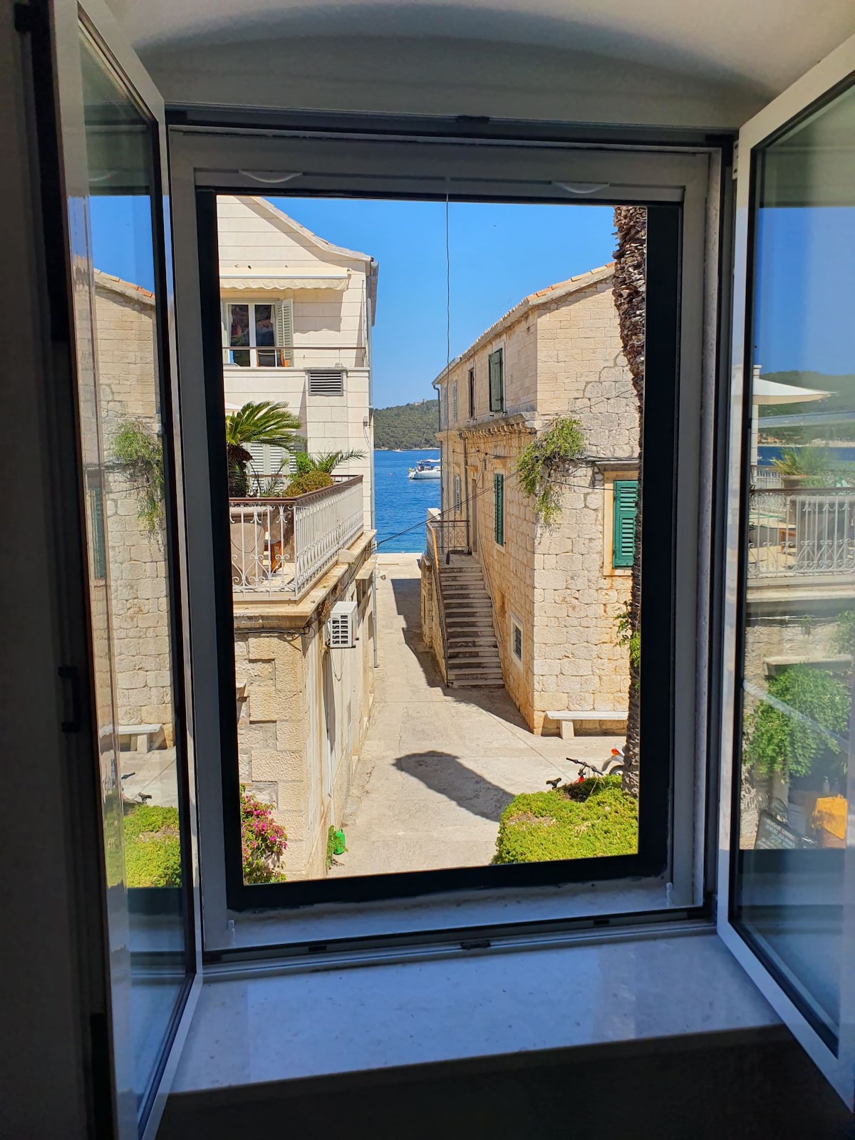 Stan od 60 m 2 sastoji se od spavaće sobe sa velikim bračnim krevetom, kupatila, prostrane dnevne sobe sa kuhinjom, predsoblja i balkona. Ceo južni zid okrenut ka moru, koje je stakleno staklo, tako da je prostor svetao, a sa balkonom je mesto. Apartman se nalazi na trećem spratu kuće, u neposrednoj blizini centra grada (5 minuta prijatne šetnje uz more), a ima balkon sa otvorenim pogledom na more i ostrva, jer se kuća nalazi u prvom redu pored mora.