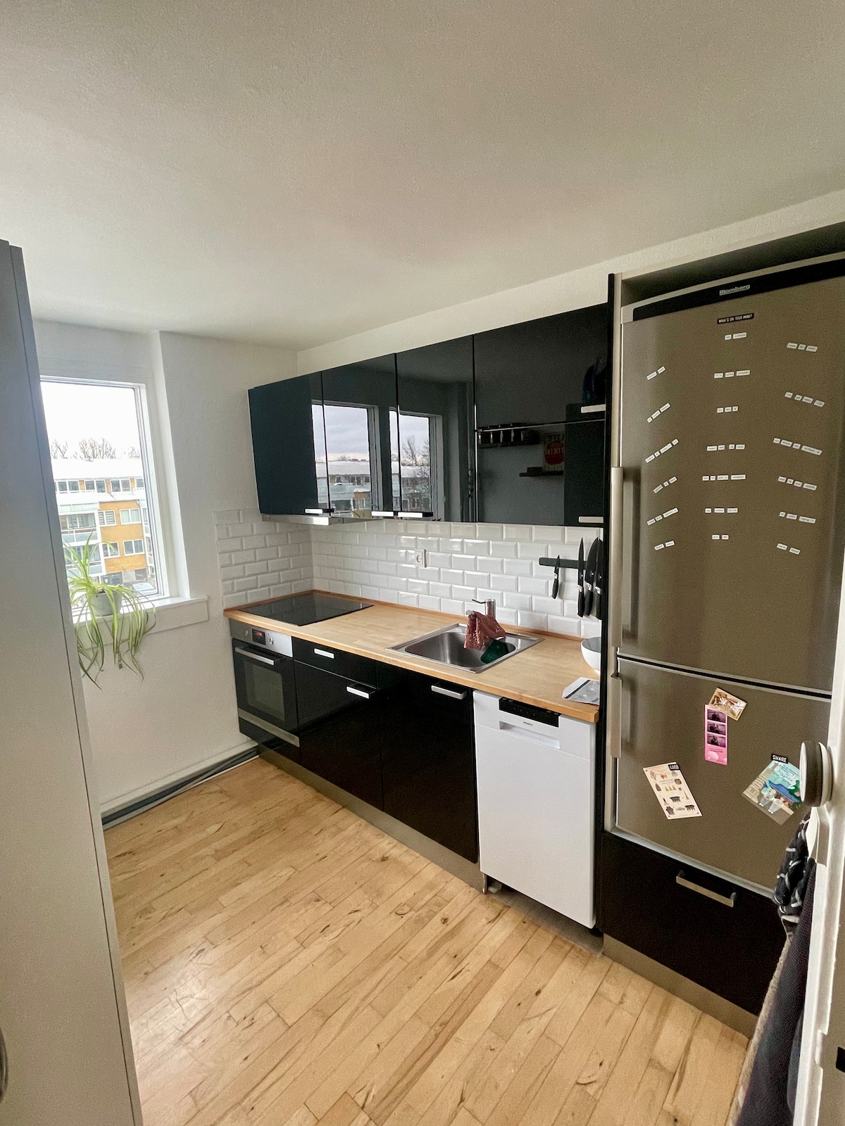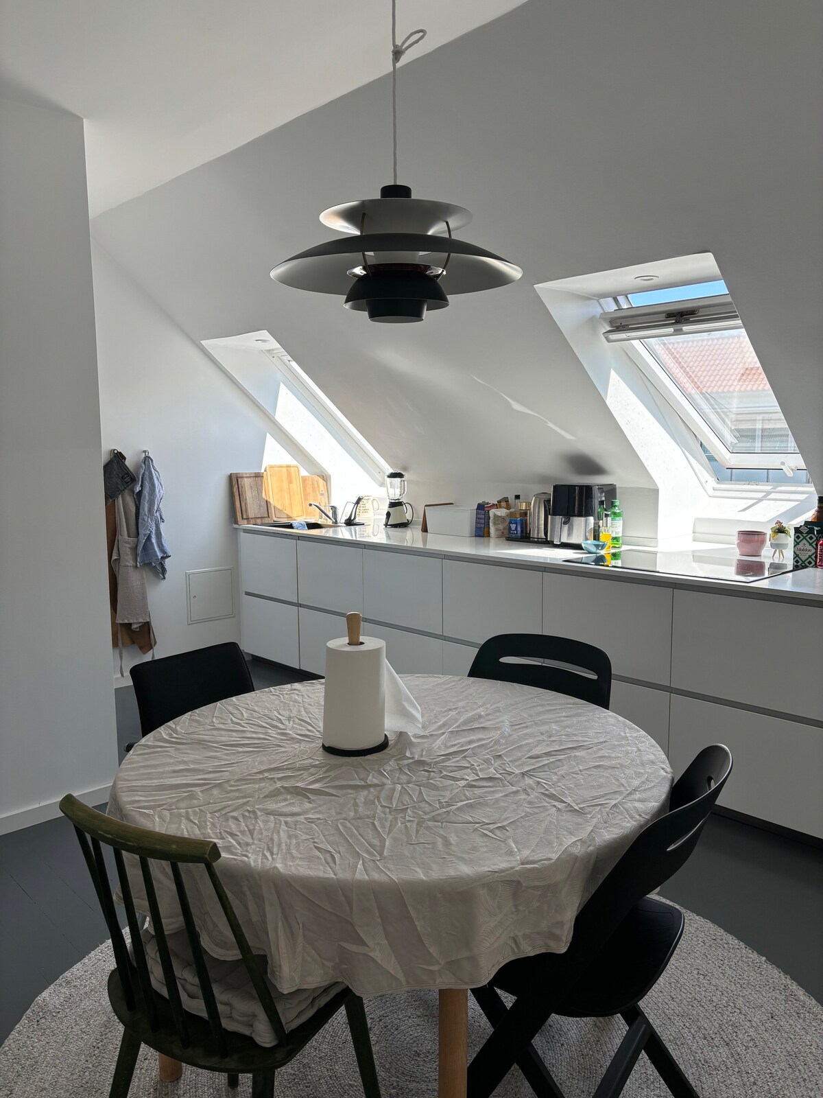 Dobro došli u naš dom, gdje se prostranost susreće s čistoćom i osvjetljenjem. Ovo moderno utočište nudi zadivljujući pogled na pejzaž grada, pozivajući vas da se opustite i uronite u novoizgrađeni urbani šarm - Grønttorvet. Od marta do oktobra možete da doživite dugi nordijski ljetnji zalazak sunca iz naše dnevne sobe/trpezarije. S otvorenim rasporedom kuhinje, ovaj prostor je savršen za druženje za par, prijatelje ili malu porodicu.