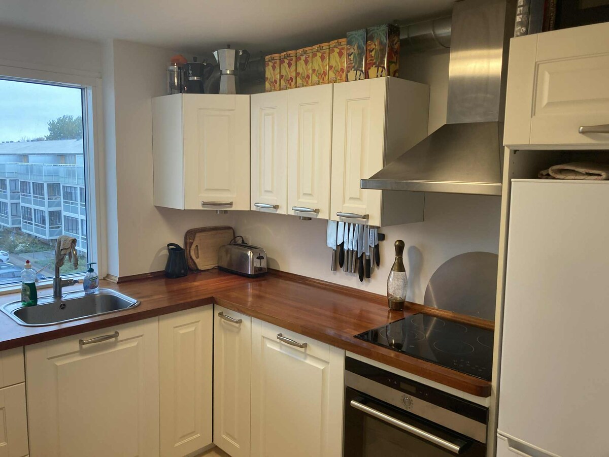 Mali, ali udoban stan u Hvidovreu. 15 minuta od aerodroma CPH. Blizu autoputa Besplatan parking 24/7 Aparat za espreso. Supermarket je udaljen 1 minut, restorani su iza ugla. U blizini željezničke stanice, odvedite se na centralnu stanicu za 8 minuta , a autobus je odmah ispred. Plaža i luka udaljeni su 10 minuta kolima. 1 spavaća soba s krevetom dimenzija 160 x 200 cm i ravnim ekranom od 55 inča. Kuhinja/dnevna soba sa velikim kaučem, dovoljno velikim za spavanje. TV od 85 inča i krevet 140 x 200 cm. Lepo kupatilo. Privatni smještaj sa privatnim predmetima