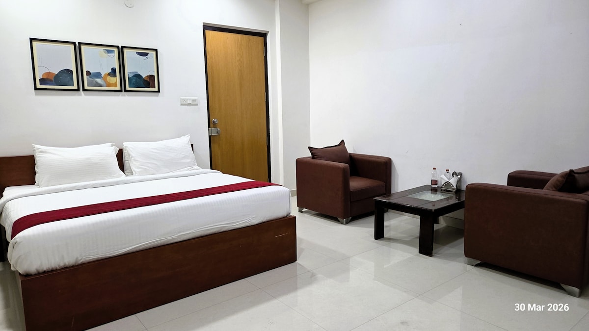 Dobro došli u The Airport Villa - ekskluzivni luksuzni dom sa 2 spavaće sobe i punim klima-uređajem, koji se nalazi u Šamshabadu u blizini NH-44. Savršeno za porodice, poslovne boravke, privatne događaje i snimanje filmova. Rezervacije nijesu dozvoljene za nevjenčane parove ili grupe mješovitih spolova. Gosti mogu da uživaju u brzom Wi-Fi-ju, mirnim spoljnim prostorima obloženim tikovinom i elegantnim enterijerima. Nježni petogodišnji njemački ovčar takođe živi na imanju u zasebnoj kući.