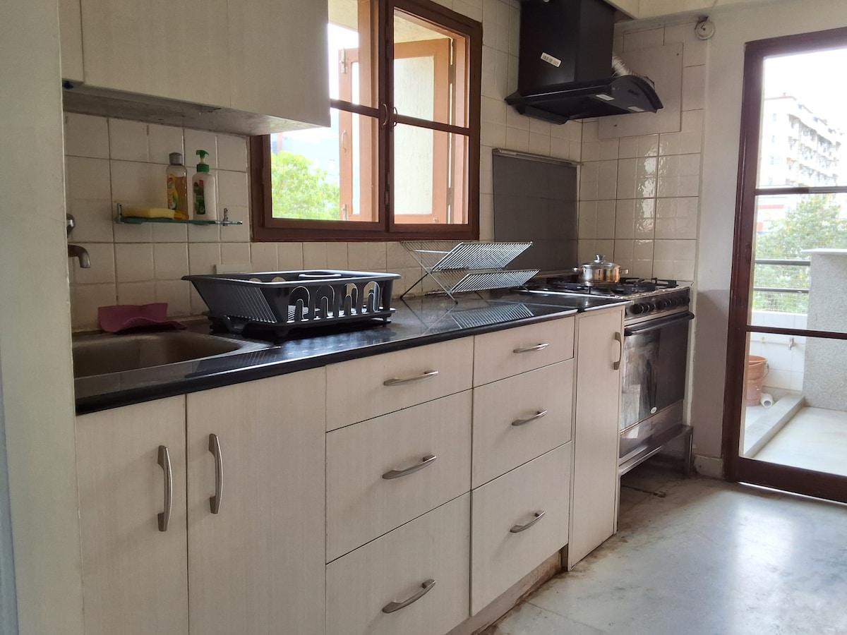 Welcome to your ideal home away from home. Our apartment is on the first floor of the villa without a lift, exclusively for the families only. Unmarried couples and Bachelors are restricted. Our apartment is spacious. A/C in both the bedrooms, with attached bathrooms. Featuring two spacious bedrooms, our retreat ensures a peaceful night's sleep . The master bedroom is with a king-size bed, while the second bedroom is with 2 Single beds, and two additional floor mattresses.