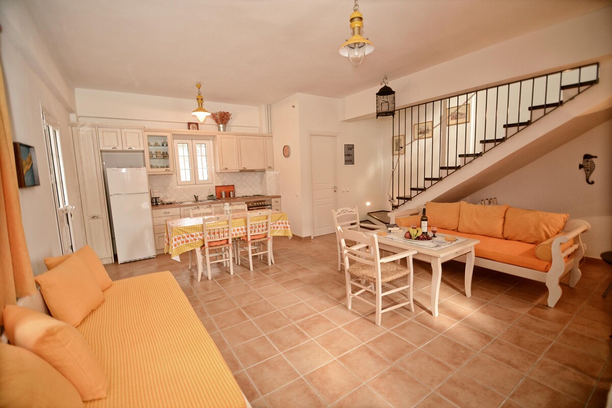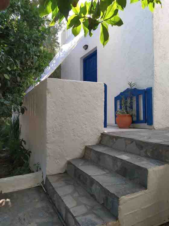 Kuća je udaljena 7 minuta od mora, okružena je poljem od 1,5 hektara koje ima mnogo stabala maslina. Iznajmljena soba se nalazi na prvom spratu kuće sa privatnim ulazom, ima balkon od 20 m sa odličnim pogledom na more. Soba se takođe nalazi u blizini prodavnica. Posetioci takođe mogu da koriste dvorište. Region je veoma miran. Soba je tradicionalno namještena u odnosu na tradiciju ostrva. Pod je drven kao krov, vrata i prozori. Takođe je potpuno opremljen modernim sadržajima.