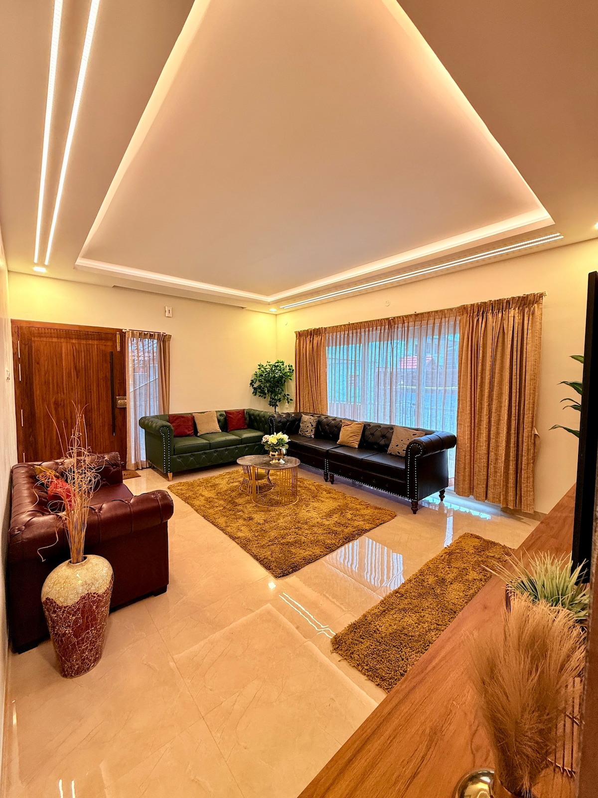 Enjoy a stylish experience at this centrally-located place. 6 spacious king size bedrooms with attached bathrooms, 3 bedrooms on ground floor and 3 bedrooms on first floor. Each floor has its own living room with Samsung 55 inch smart tv, dining room. Ground floor has indoor fireplace and all bedrooms and living room on the first floor have attached balcony. Reliable wifi capable of 4k movies 2 indoor car parking