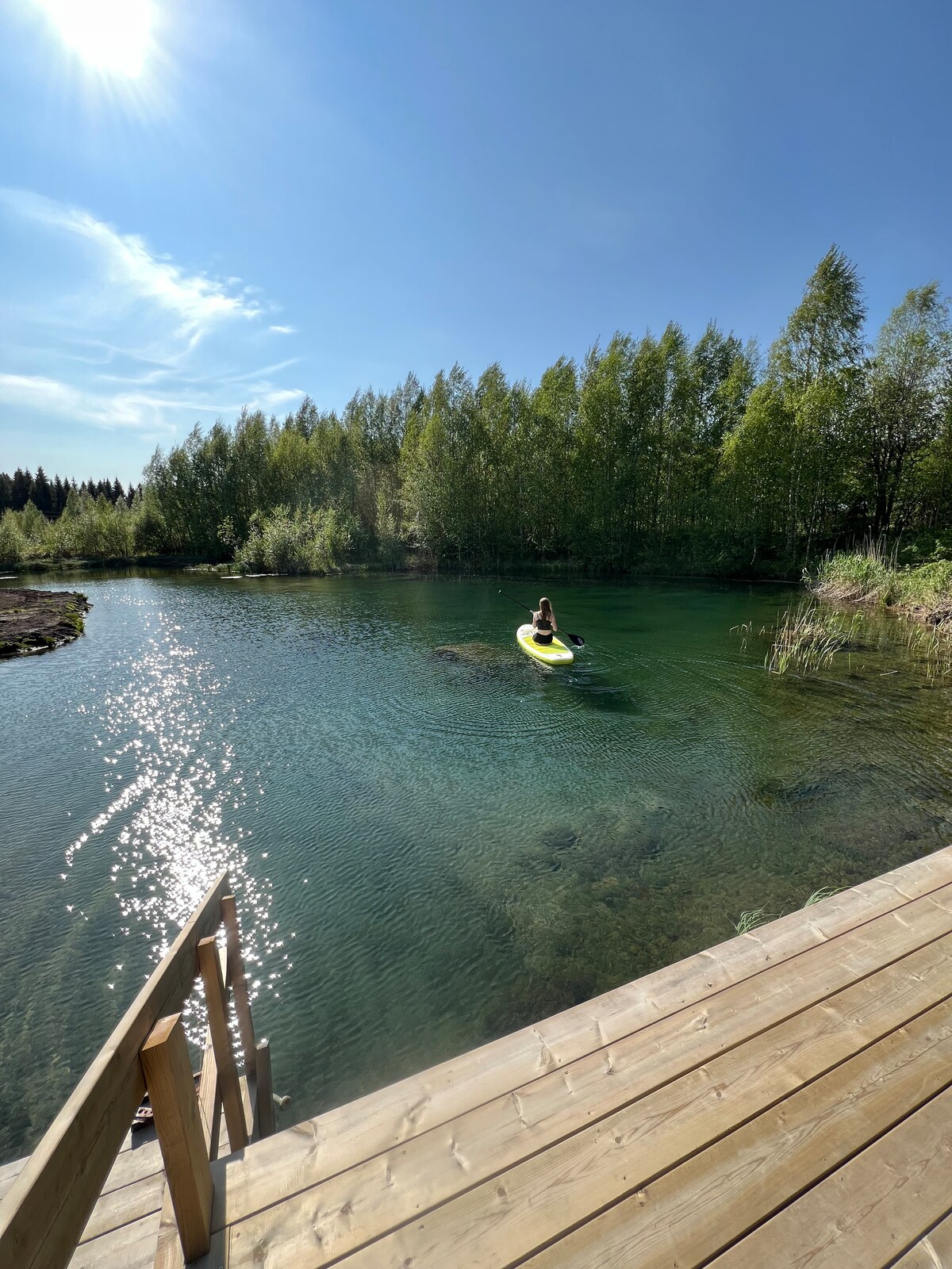 Udobna vikend kuća izgrađena 2019. godine, u kojoj se udobno može smestiti 6 osoba koje uživaju u prelepom jezeru. U jednoj spavaćoj sobi bračni krevet (160 cm), u drugoj 2 bračna kreveta (140 cm) kao krevet na sprat. U vikendici se nalaze tuš i toalet. Na terasi pored jezera nalazi se mala nadstrešnica, roštilj na plin i trpezarijski sto. Uz saunu u bačvi nalazi se bačva za kupanje i terasa na kojoj sjaji večernje sunce. Plaža je plitka i pogodna i za decu. Parcela je mirna i zaštićena drvećem od suseda. Bez kućnih ljubimaca.