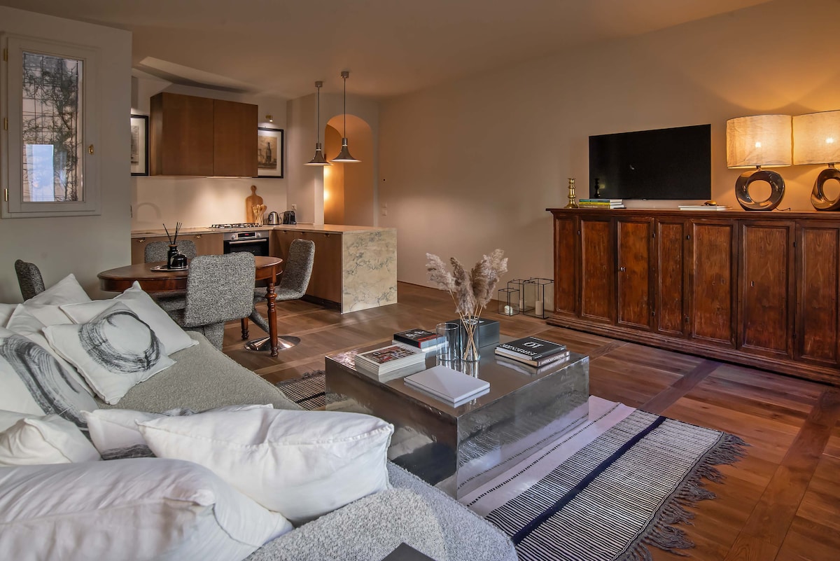 Dobro došli u rodno mjesto Benvenuto Cellinija. Jedan od najistaknutijih umjetnika 16. vijeka. Sa zlatom i srebrom, oblikovao je snove. Slike koje krase stan ispričaće priče o njegovim bezvremenskim remek-djelima i njegovom odvažnom, spornom duhu. Sa prozora dnevne sobe možete da se divite čuvenim spomenicima katedrale i Firence ili da vas inspiracija preplavi sa vaše privatne terase. Odavde će se Firenca sigurno ugurati u vaše srce zauvijek.