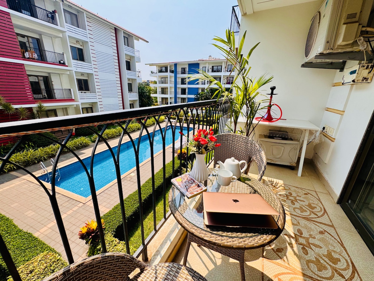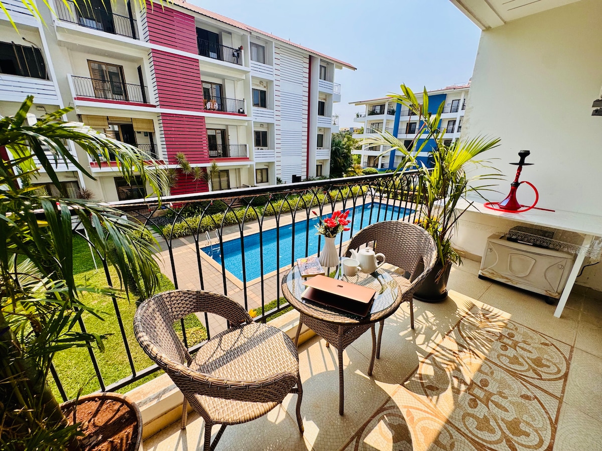10 April to 15 May pool is not functioning. Escape to our serene 1 BHK serviced apartment in the heart of North Goa. With a 'designer delight' aesthetic, this space is a perfect retreat for a short break or an extended holiday. Its 5 minutes from Baga Beach & surrounded by iconic restaurants, clubs . Enjoy access to pool, garden & 24*7 security, making your stay exceptional. This property is a rare gem offering unmatched beauty. Famous Club Diaz just 500 meters away No visitors Allowed