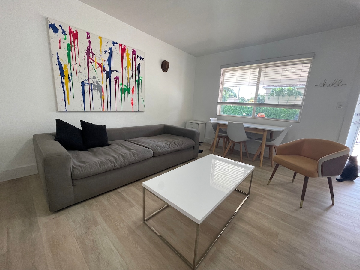**NAŠA NAJPOPULARNIJA JEDINICA** Predivno renoviran stan u Majami Biču, u tihom i bezbednom delu grada samo nekoliko koraka od okeana. Ovaj stan nudi privatan i miran smeštaj za putnike i poslovne putnike. Jedinica ima udoban bračni krevet, vešalice, mikrotalasnu rernu, frižider u punoj veličini, malu čajnu kuhinju, pametni TV, besplatan Wi-Fi i novi klima-uređaj.