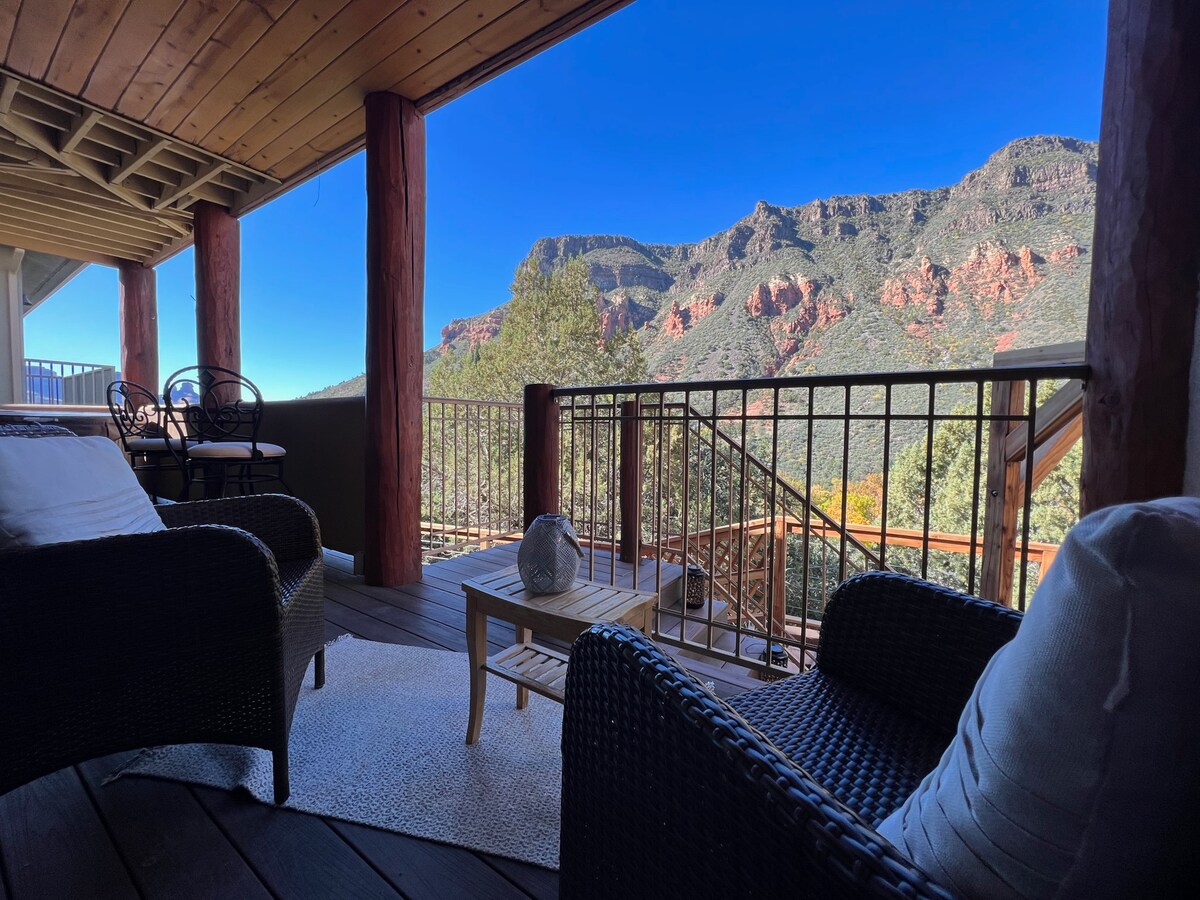 A rare private jewel set high in the red rocks of Sedona's breathtaking Oak Creek Canyon. Peaceful hideaway balconies, offer extraordinary views from the hot tub or the stargazing deck! Enjoy a glass or meal overlooking the grand, creek-fed Cottonwood trees and basking in star-filled skies. Or cozy up by the fire inside. In autumn, leaves sweep the canyon below with brilliant colors. Immerse yourself in the intimate replenishing magic of the Canyon.