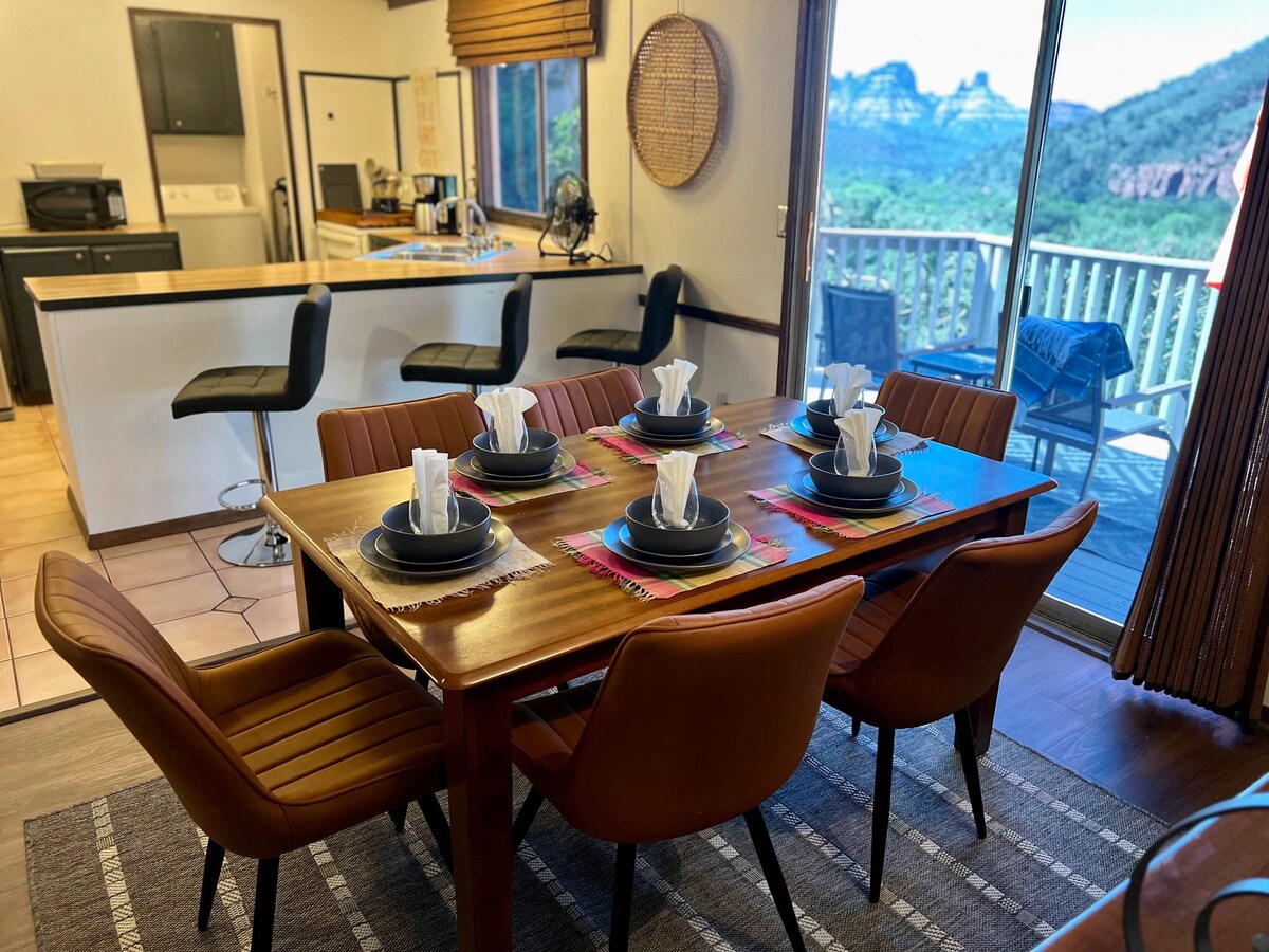 PREGLEDI, POGLEDI, POGLEDI! Opustite se i opustite u našem domu pogodnom za porodice sa 3 kreveta/2 kupatila koji se uzdiže do Nacionalne šume Kokino. Pogled iz dnevnog boravka i trijema pruža vam zadivljujući pogled na planine i kanjone Sedone. Uživajte u ovim pogledima sa čašom vina u ruci ili radite od kuće na stolovima u unutrašnjem dvorištu, sa slikovitim planinama u pozadini. Nekoliko minuta od centra Sedone, Slide Rocka i nekih od najlepših šetnji u gradu. Savršena oaza za planinare i porodice!