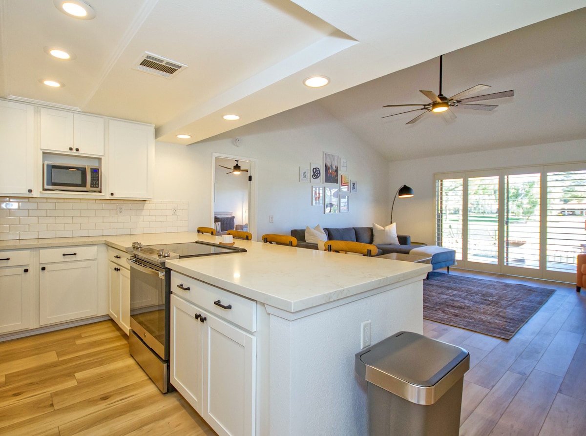 The Legacy Palms is a newly renovated, spacious & bright 2 bedroom, 2 bath condo with a modern California-desert vibe. French doors open to a large private balcony with dining and sitting area, overlooking the lush villa grounds & water fountains. It features a full kitchen with new stainless steel appliances, 3 smart TV's, dining area, 2 fireplaces and pull out queen sleeper couch in the living area. The community grounds feature 12 heated pools and spas, a gym, hammocks, grills and more!