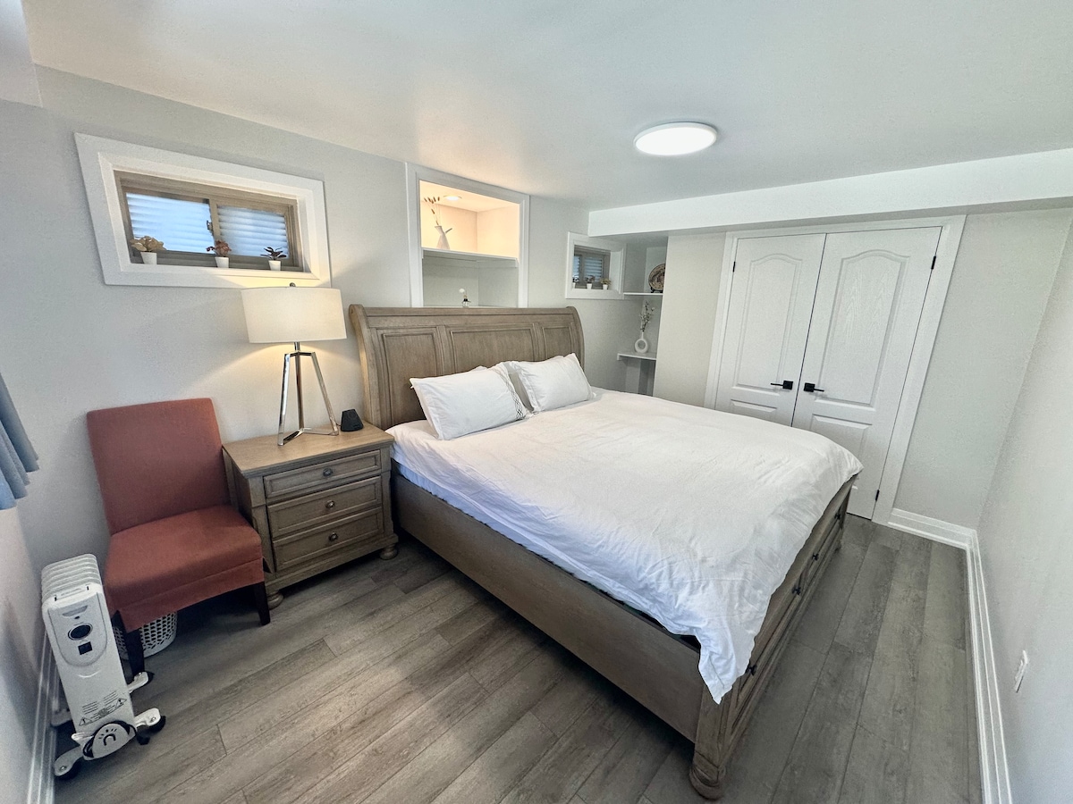 Osjećajte se kao kod kuće u našem udobnom, ali prostranom podrumskom apartmanu. Samo nekoliko koraka od Royal Victoria Hospital & Georgian College, Access to HWY 400 near, you are also minutes to downtown Barrie's scenic waterfront. Čist, moderan prostor dizajniran za praktičnost — idealan za kraće ili duže boravke. Čeka vas udoban odmor Ključne posebnosti > Praonica veša u apartmanu >Samostalna prijava >Smart TV sa Netflix-om, Youtube-om i PrimeVideo-om >Bračni krevet (širine 150-179 cm) >Opremljena kuhinja sa svim potrebnim priborom za kuvanje >Wi-Fi produživač za brzi Wi-Fi